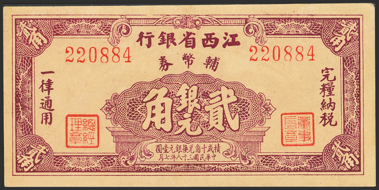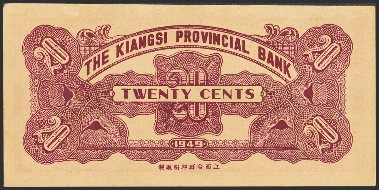 CHINA. 20 Cents. 1949. Kiangsi Provincial Bank. (Pick: S1089D). Less than Uncirculated.