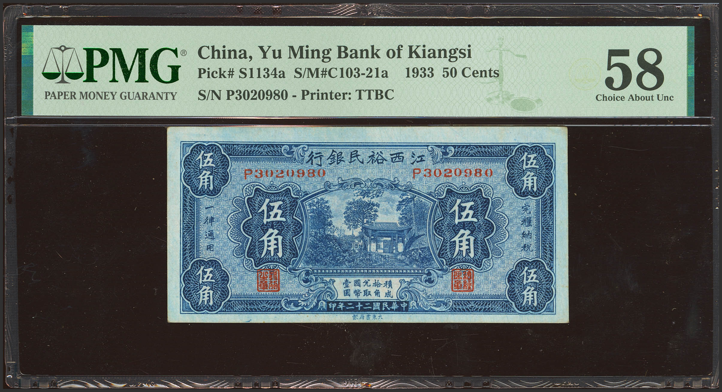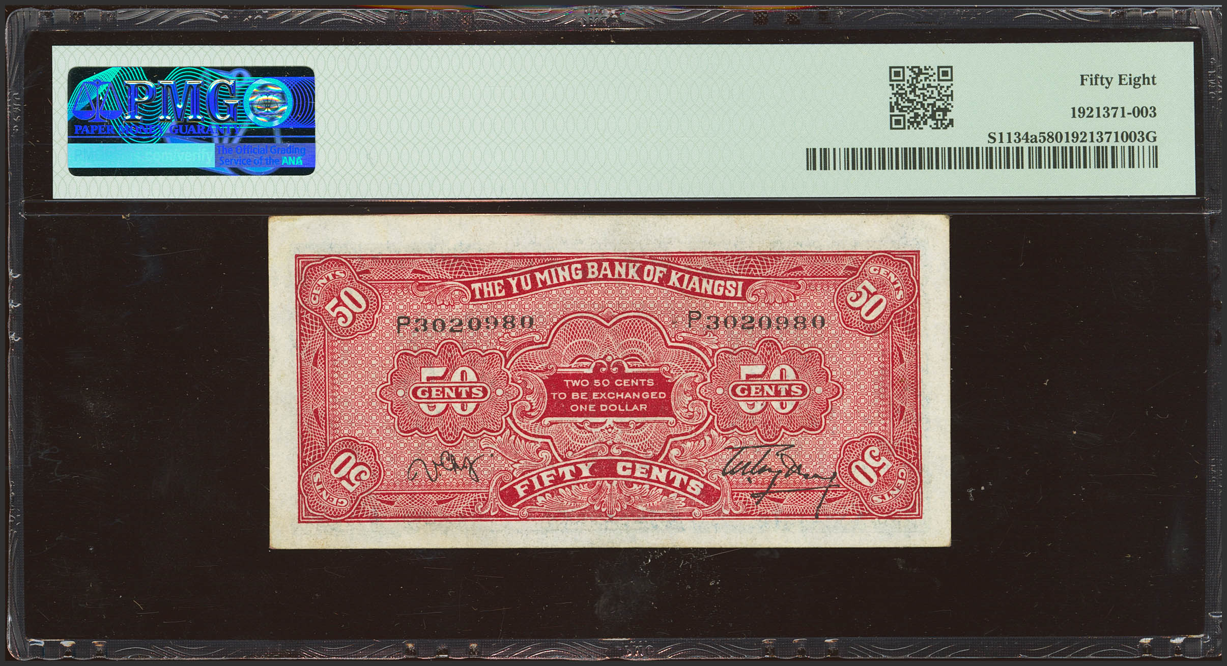 CHINA. 50 Cents. 1933. Yu Ming Bank of Kiangsi. (Pick: S1134a, SM: C103-21a). PMG58.