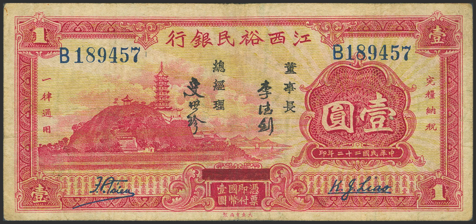 CHINA. 1 Yuan. 1933. Yu Ming Bank of Kiangsi. (Pick: S1135). Graffiti on back. More than Fine.