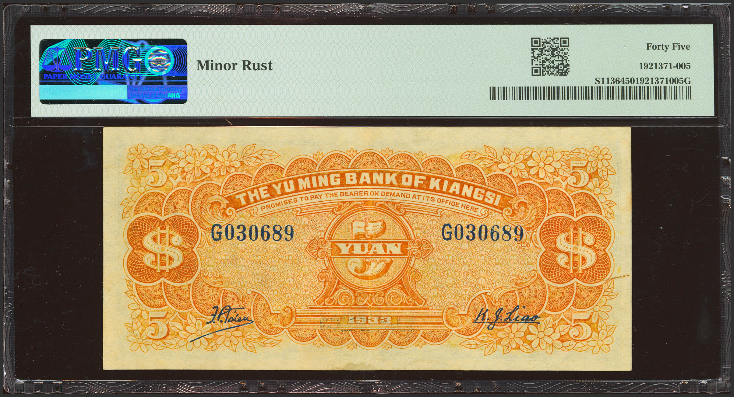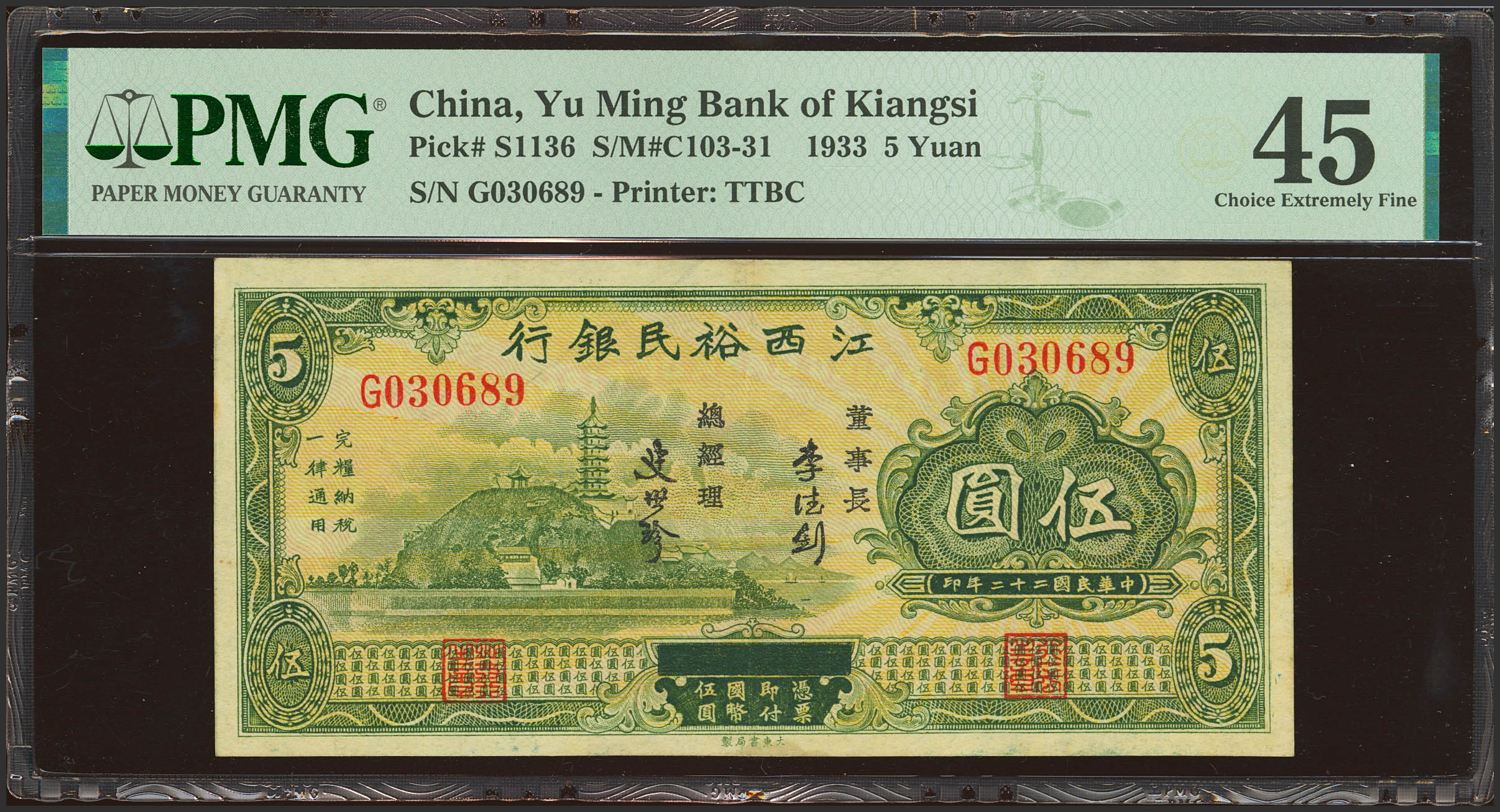 CHINA. 5 Yuan. 1933. Yu Ming Bank of Kiangsi. (Pick: S1136, SM: C103-31). PMG45 (minor rust).