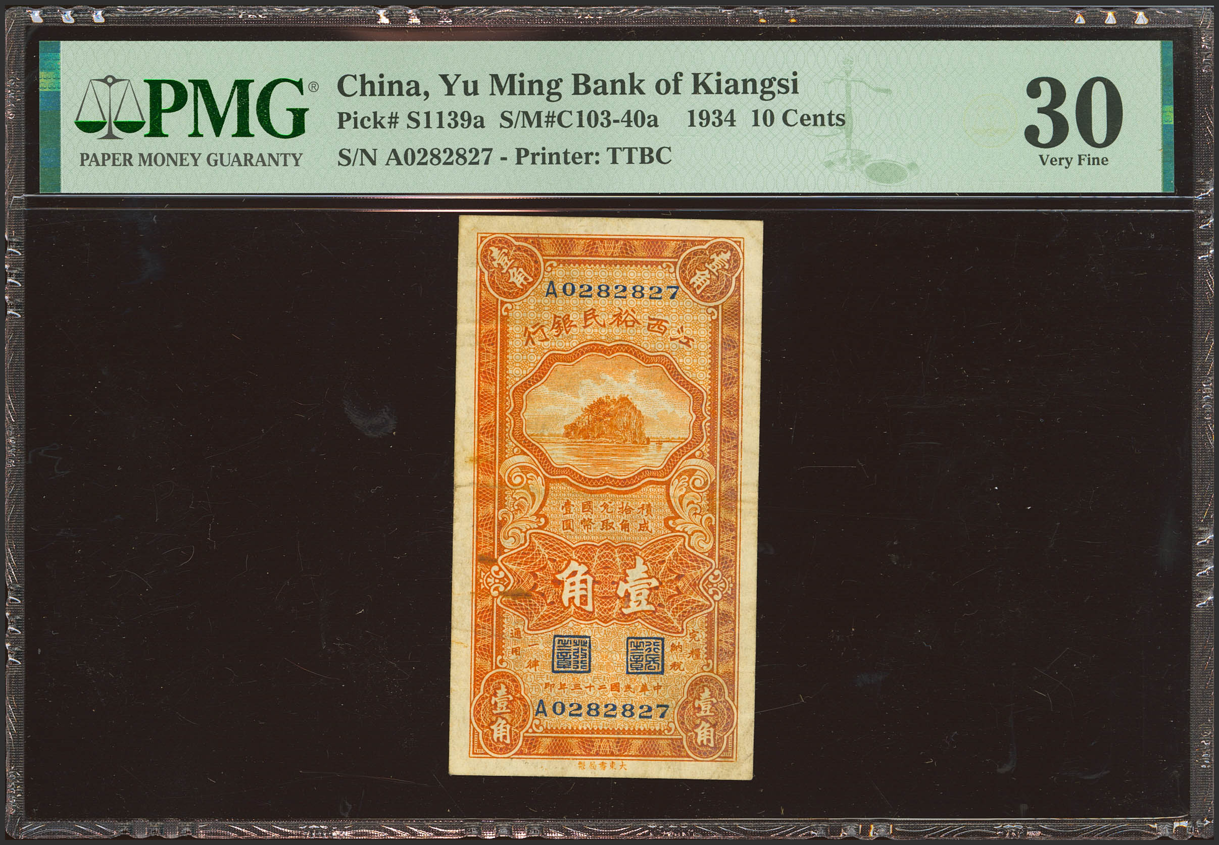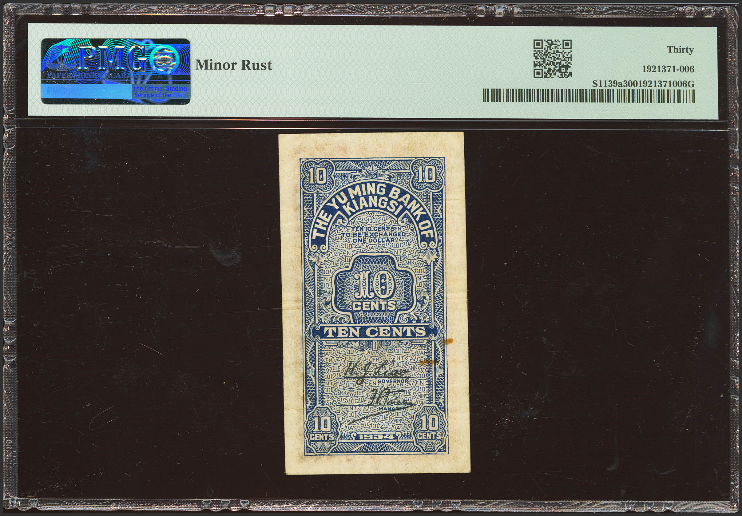 CHINA. 10 Cents. 1934. Yu Ming Bank of Kiangsi. (Pick: S1139a, SM: C103-40a). PMG30 (minor rust).