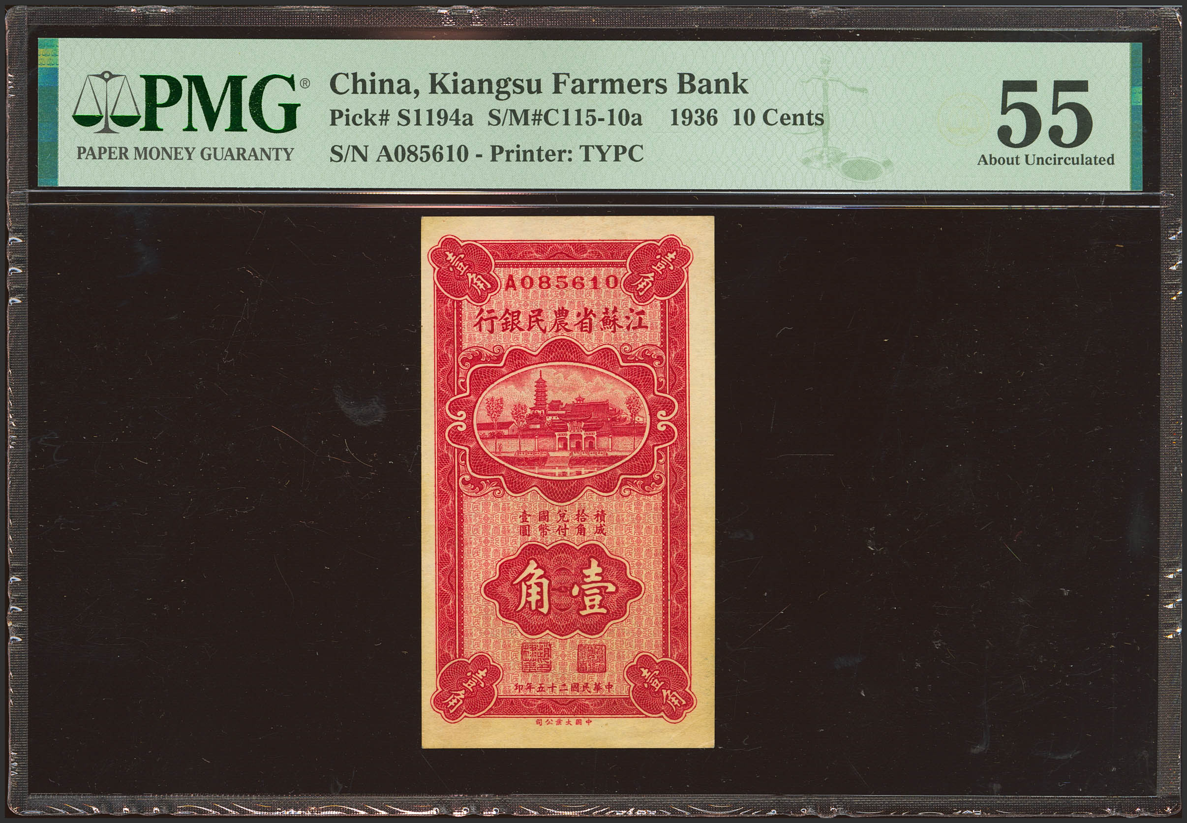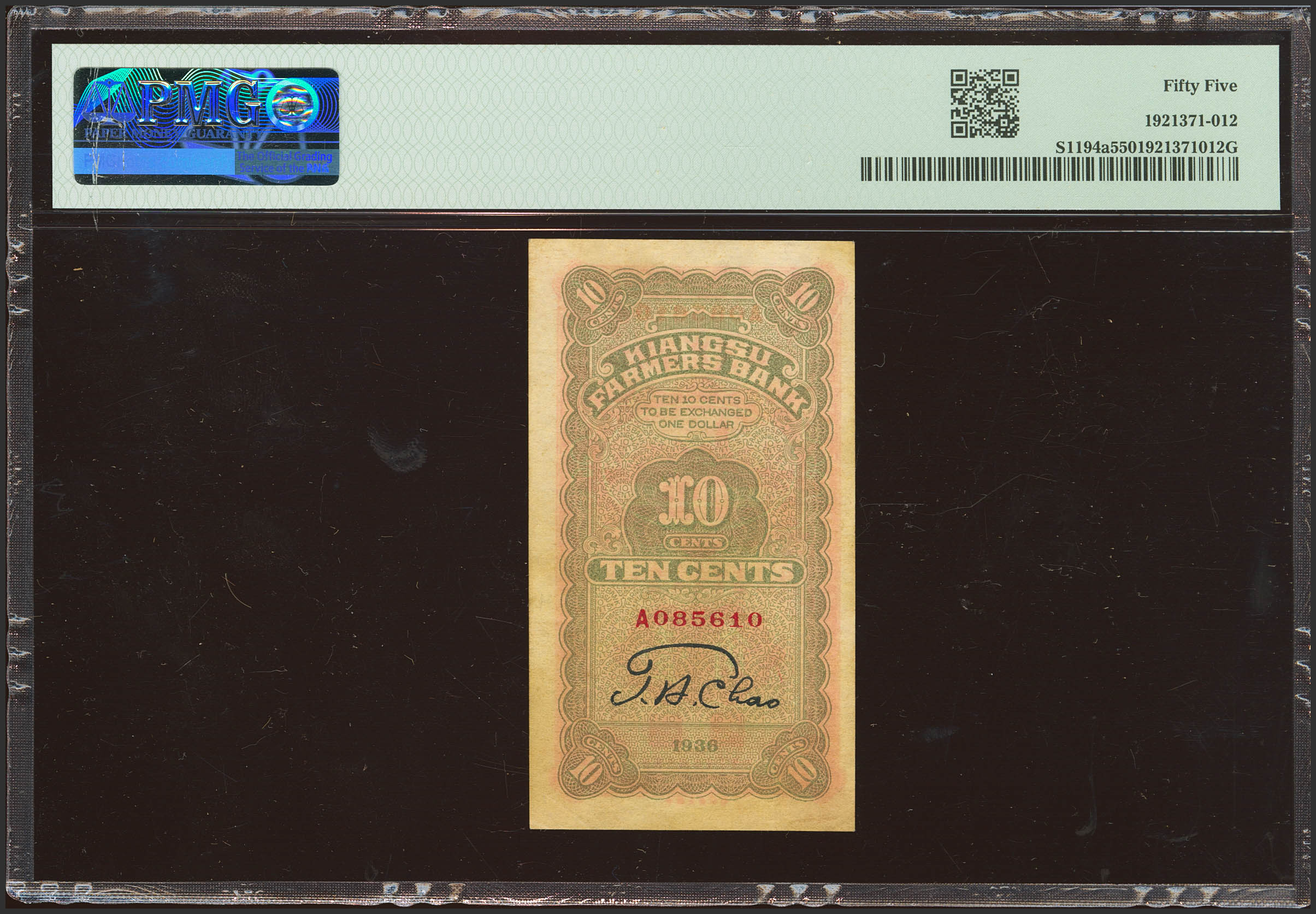 CHINA. 10 Cents. 1936. Kiangsu Farmers Bank. (Pick: S1194a, SM: C115-10a). PMG55.