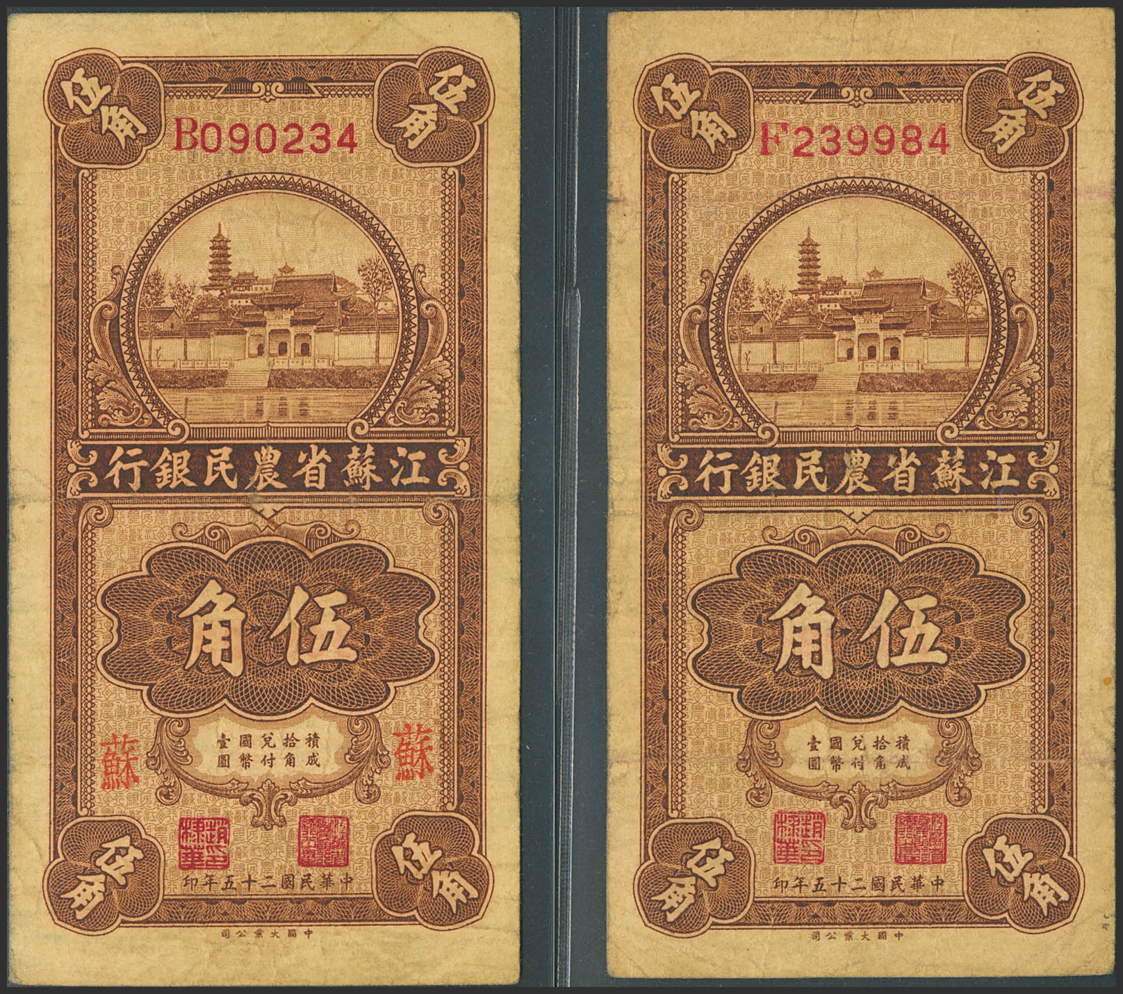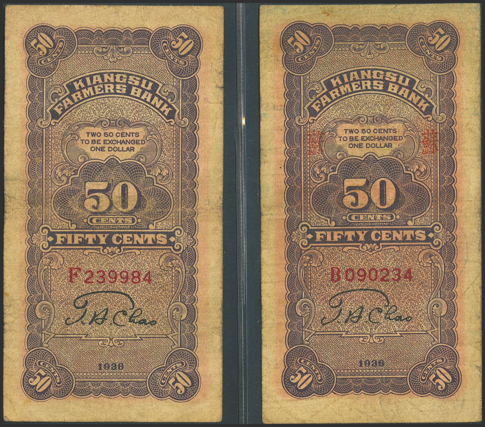 CHINA. Lot of 2 notes of 50 Cents. 1936. Kiangsu Farmers Bank. (Pick: S1198). More than Fine.