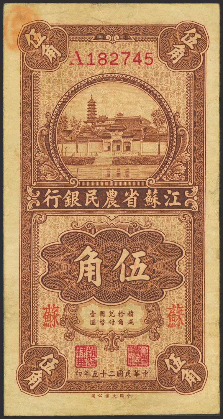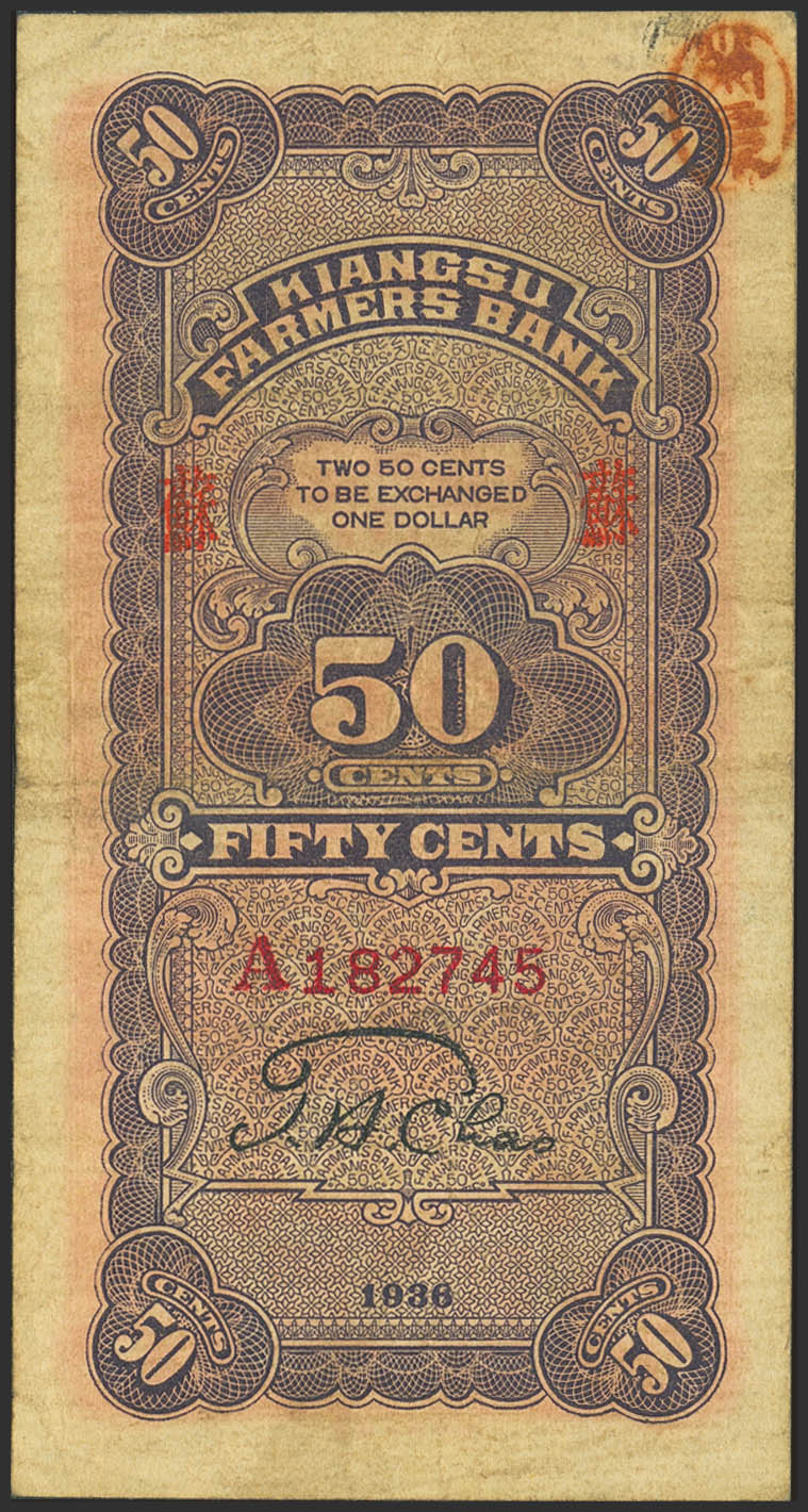 CHINA. 50 Cents. 1936. Kiangsu Farmers Bank. (Pick: S1198). Very Fine.
