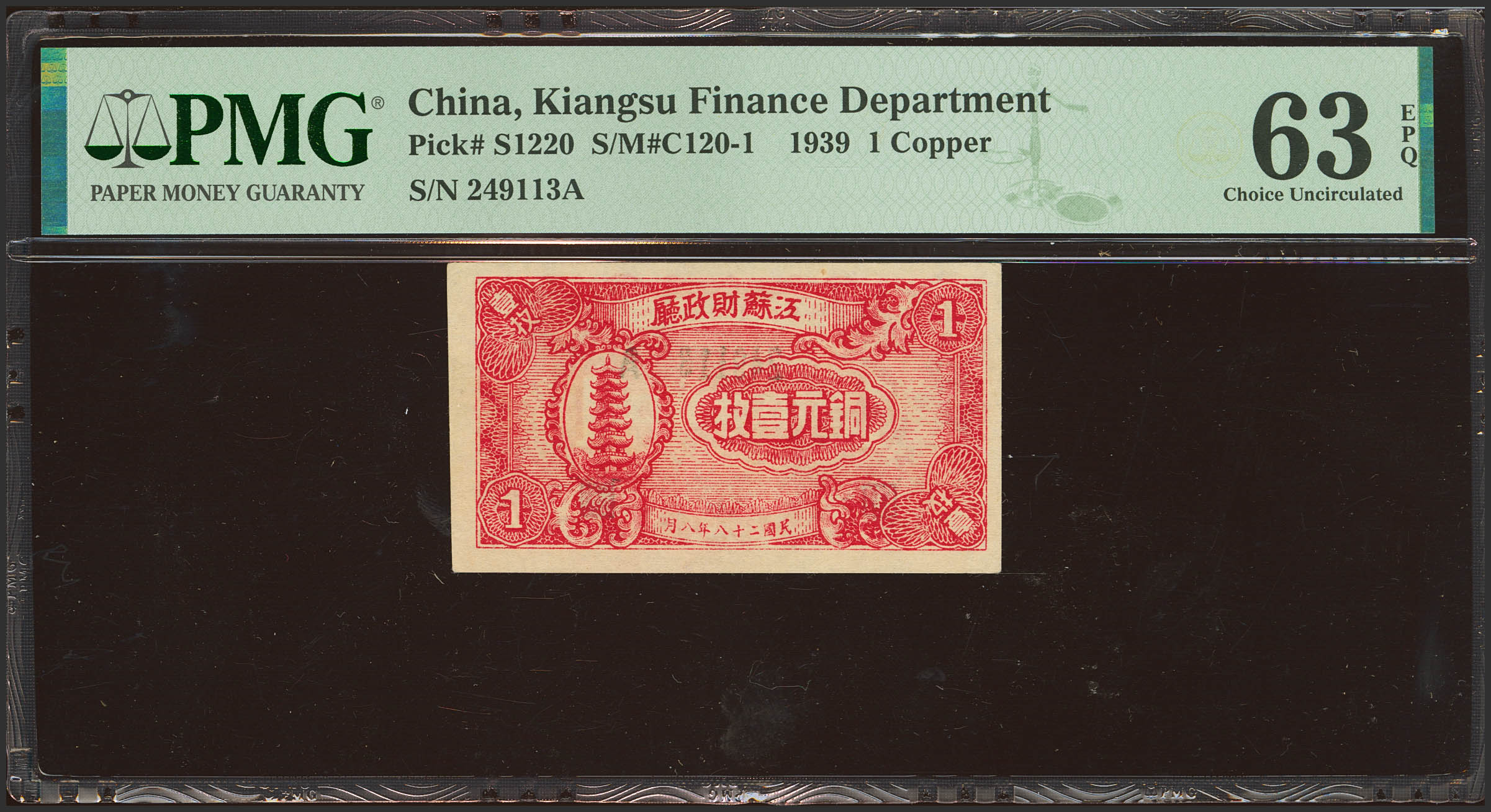 CHINA. 1 Copper. 1939. Kiangsu Finance Department. (Pick: S1220, SM: C120-1). PMG63EPQ.