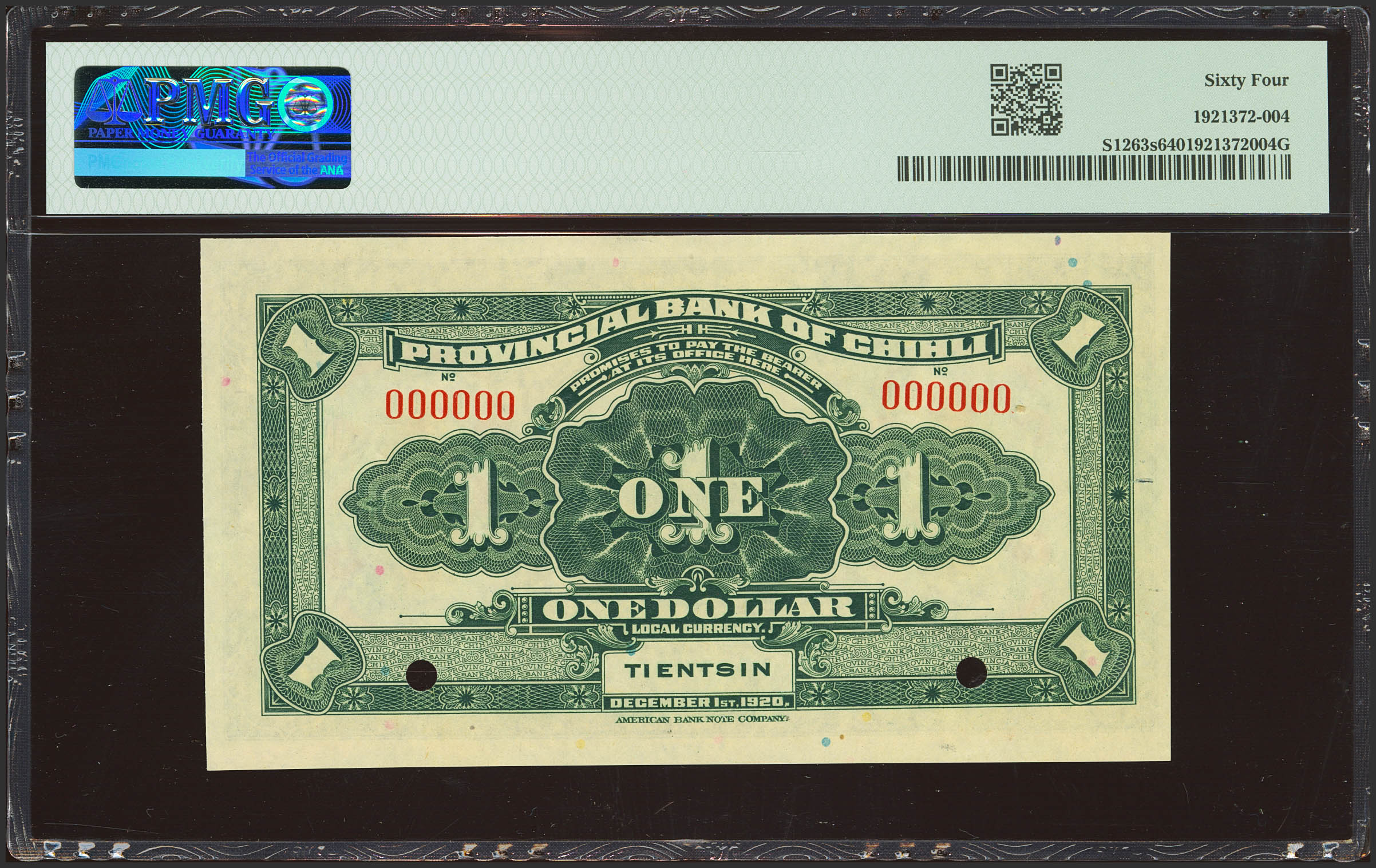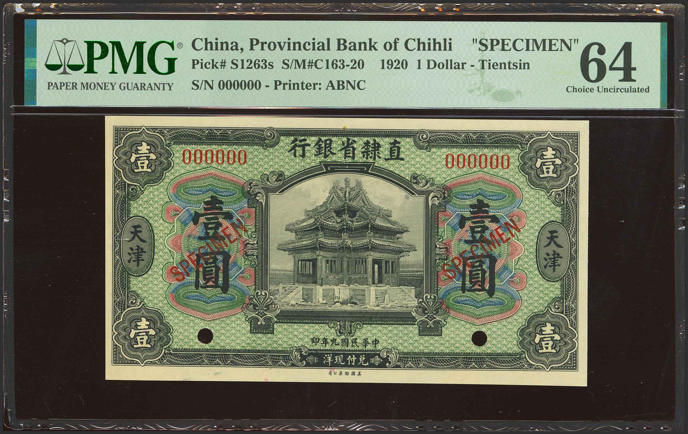 CHINA. 1 Dollar. 1 December 1920. Provincial Bank of Chihli. Tientsin. Specimen. (Pick: S1263s, SM: C163-20). PMG64.