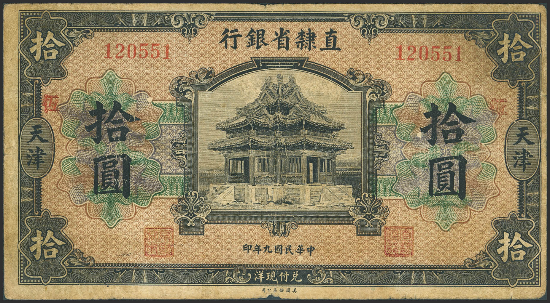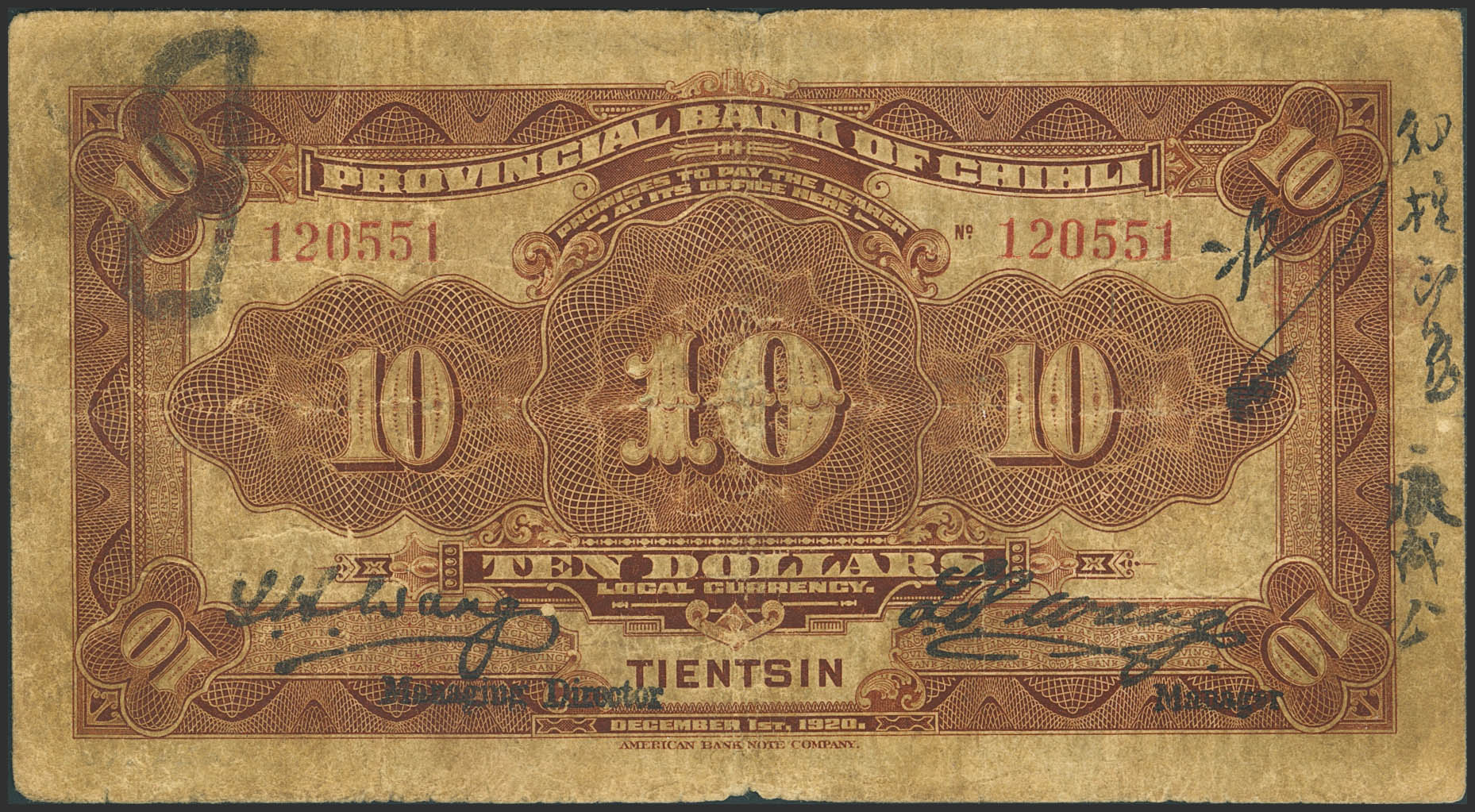 CHINA. 10 Dollars. 1 December 1920. Provincial Bank of Chihli. Tientsin. Wang and Wang signatures. (Pick: S1265c). Pinhole, 5 mm cut. Fine.