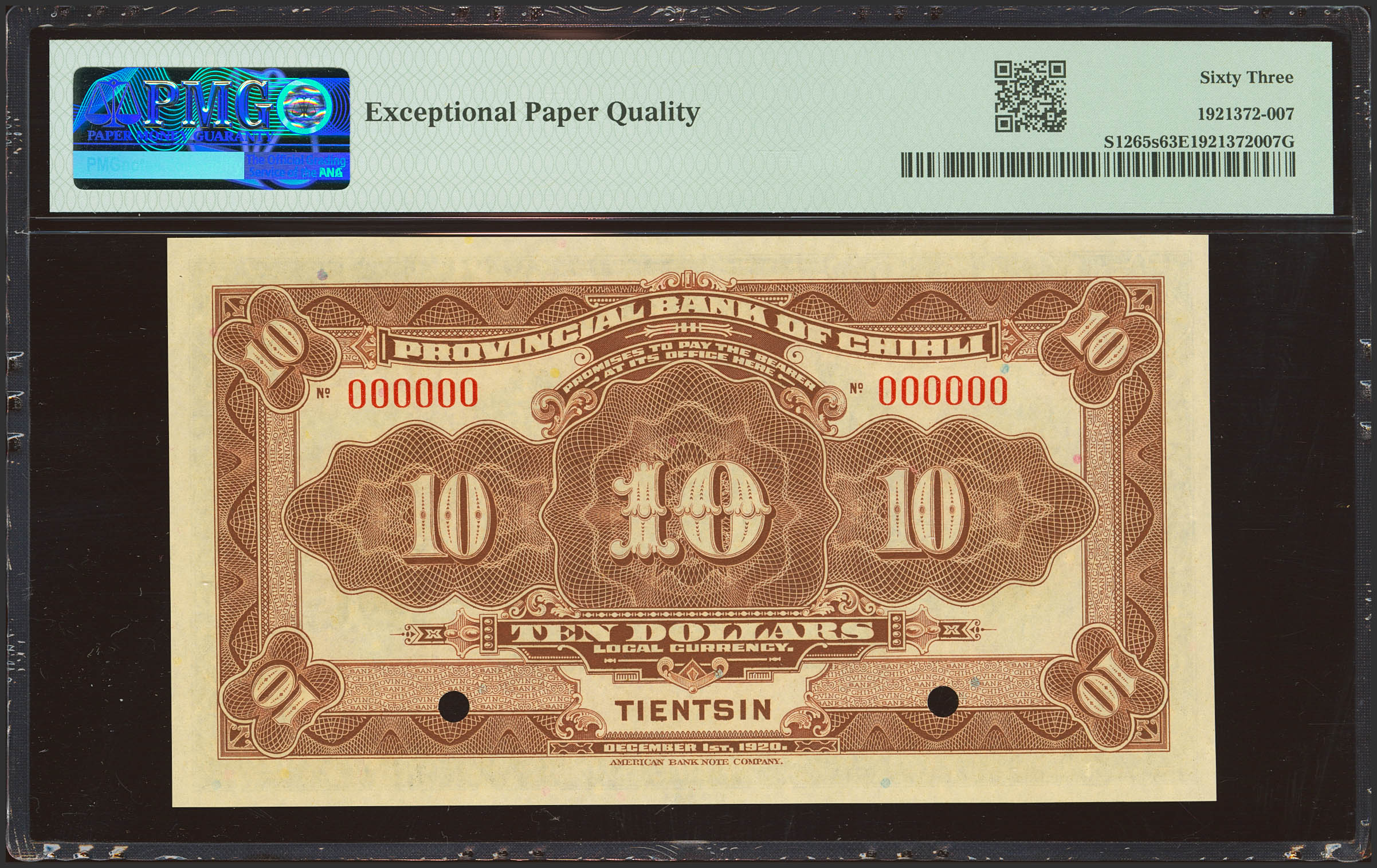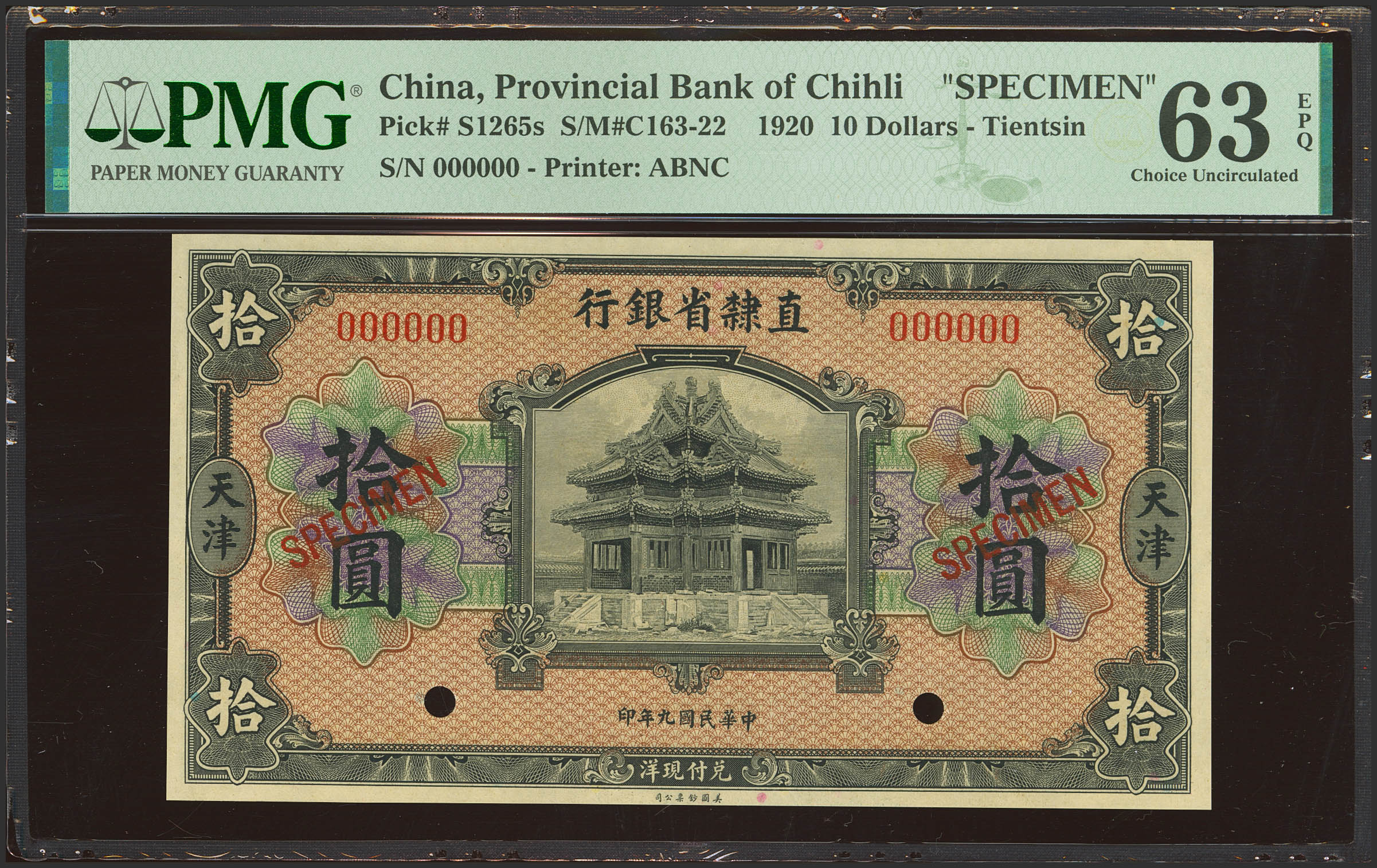 CHINA. 10 Dollars. 1 December 1920. Provincial Bank of Chihli. Tientsin. Specimen. (Pick: S1265s, SM: C163-22). PMG63EPQ.
