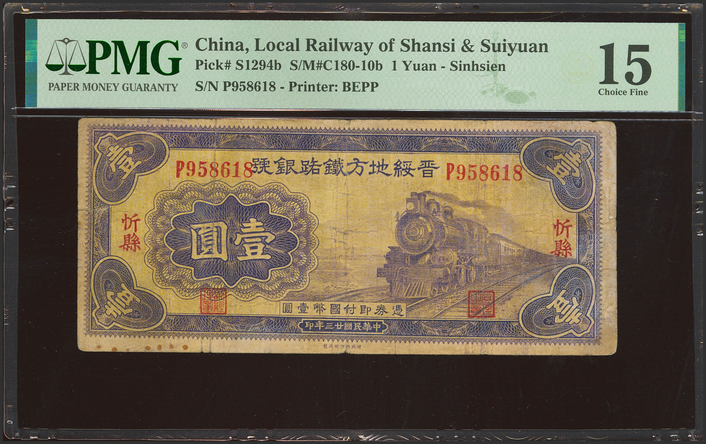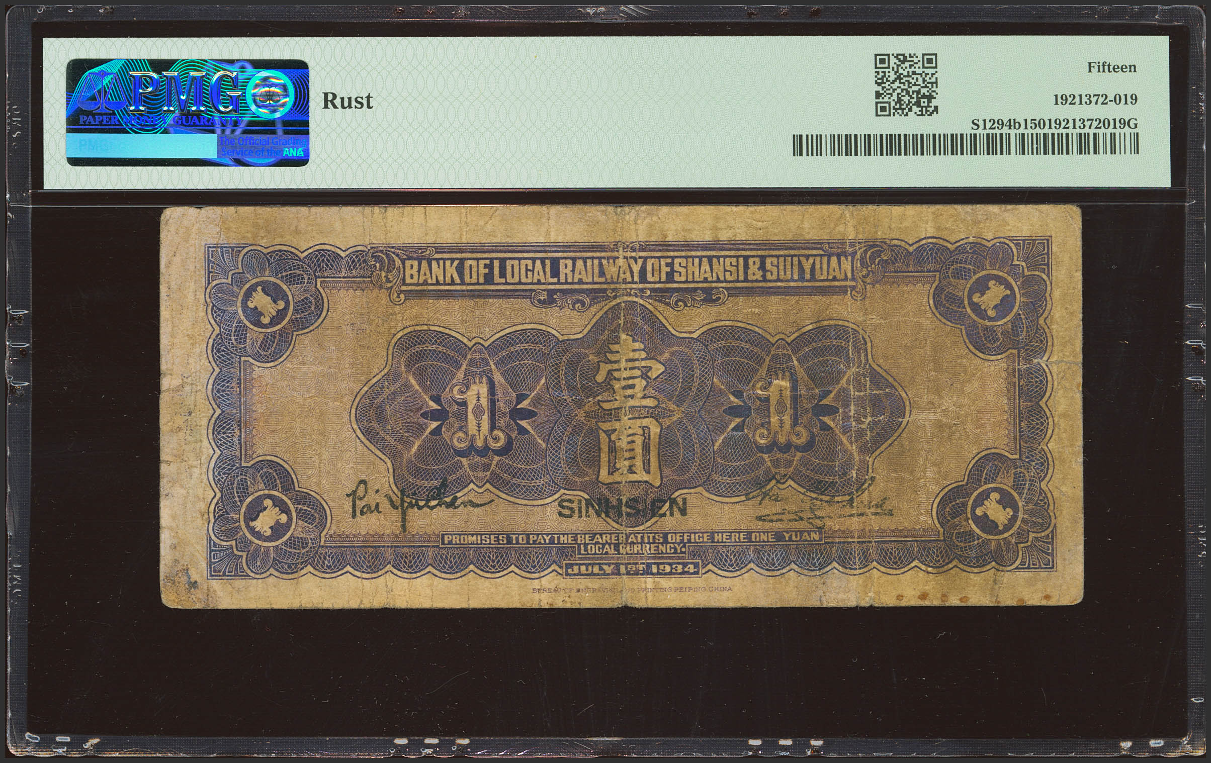 CHINA. 1 Yuan. 1 July 1934. Bank of Local Railway of Shansi and Suiyuan. Sinhsien. (Pick: S1294b, SM: C180-10b). PMG15 (rust).