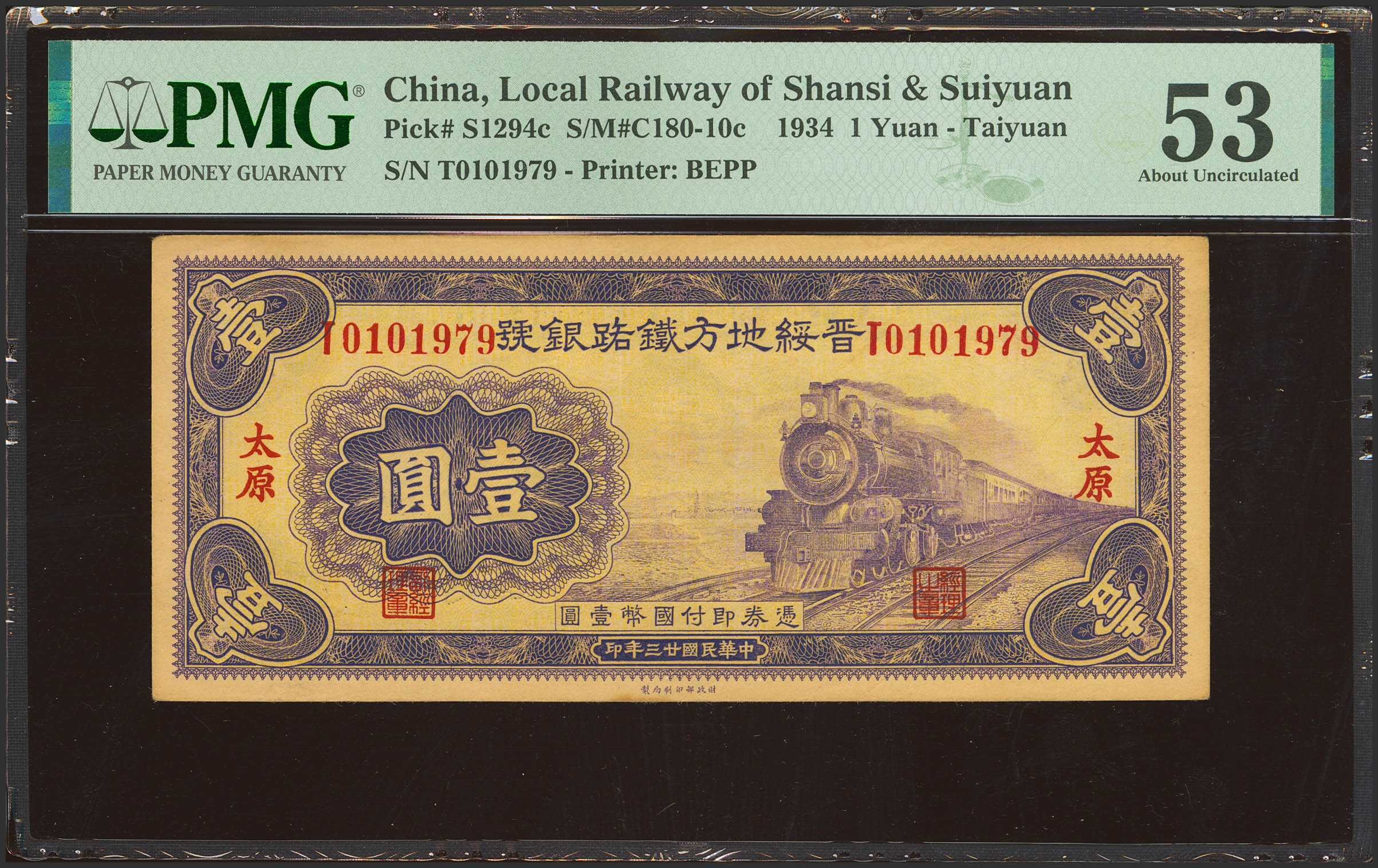CHINA. 1 Yuan. 1 July 1934. Bank of Local Railway of Shansi and Suiyuan. Taiyuan. (Pick: S1294c, SM: C180-10c). PMG53.