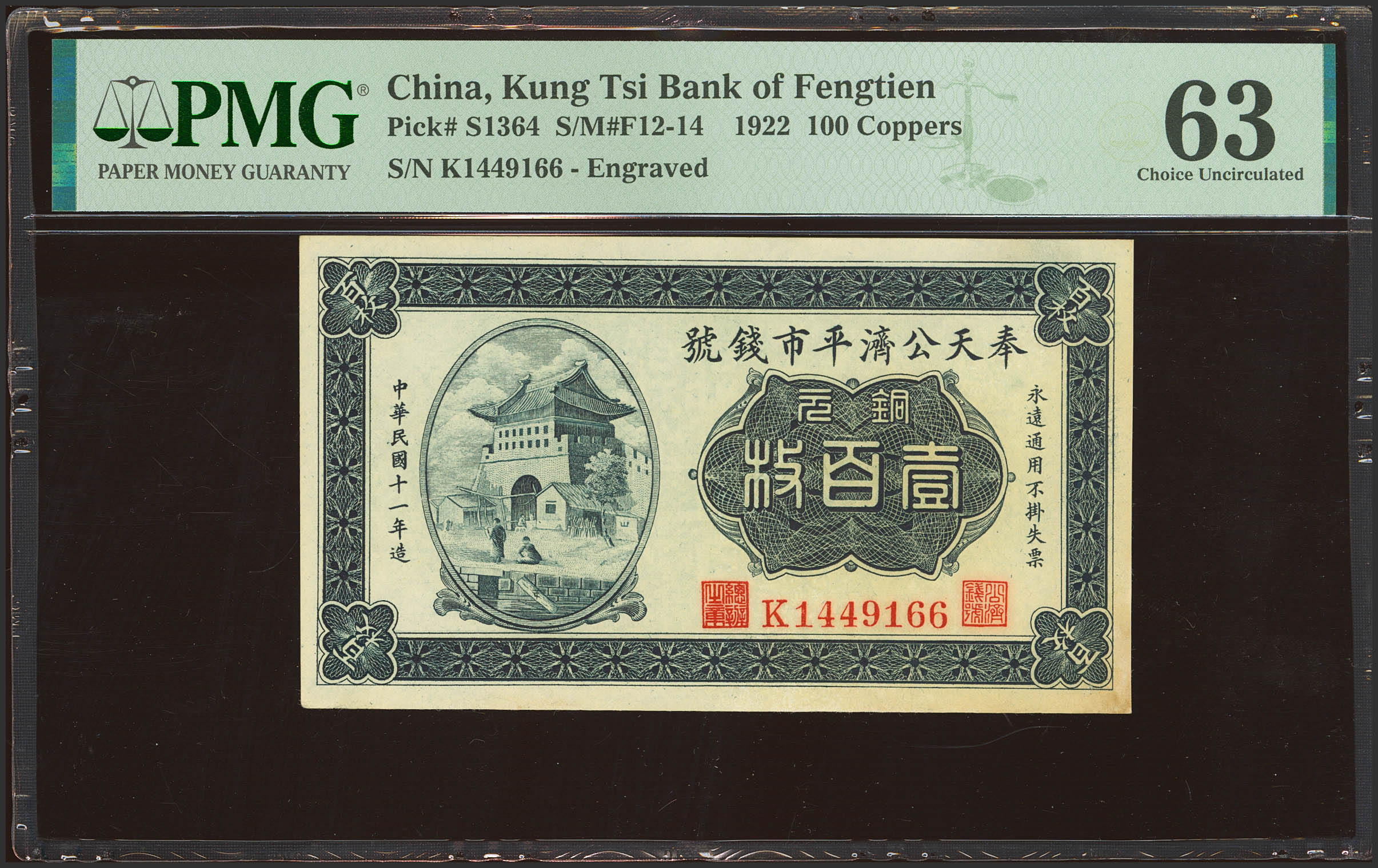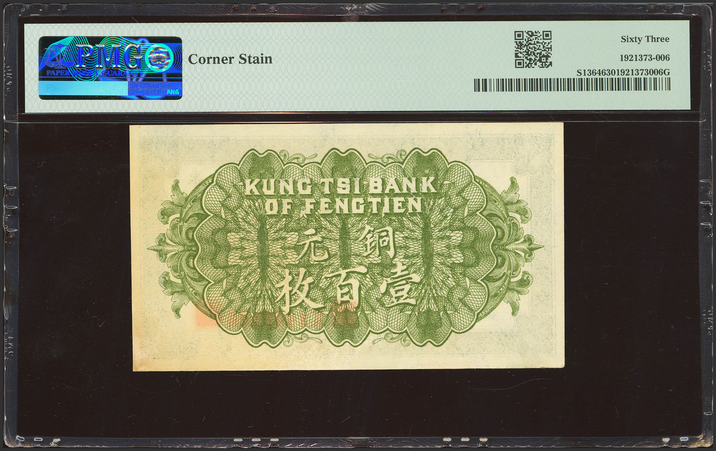 CHINA. 100 Coppers. 1922. Kung Tsi Bank of Fengtien. Engraved. (Pick: S1364, SM: F12-14). Pinhole. PMG63 (corner stain).