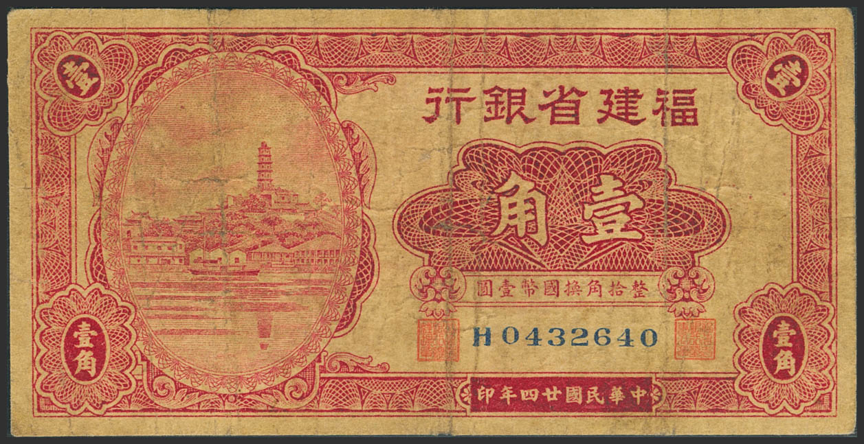 CHINA. 1 Chiao. 1935. Fukien Provincial Bank. (Pick: S1403). Pinhole. Fine.