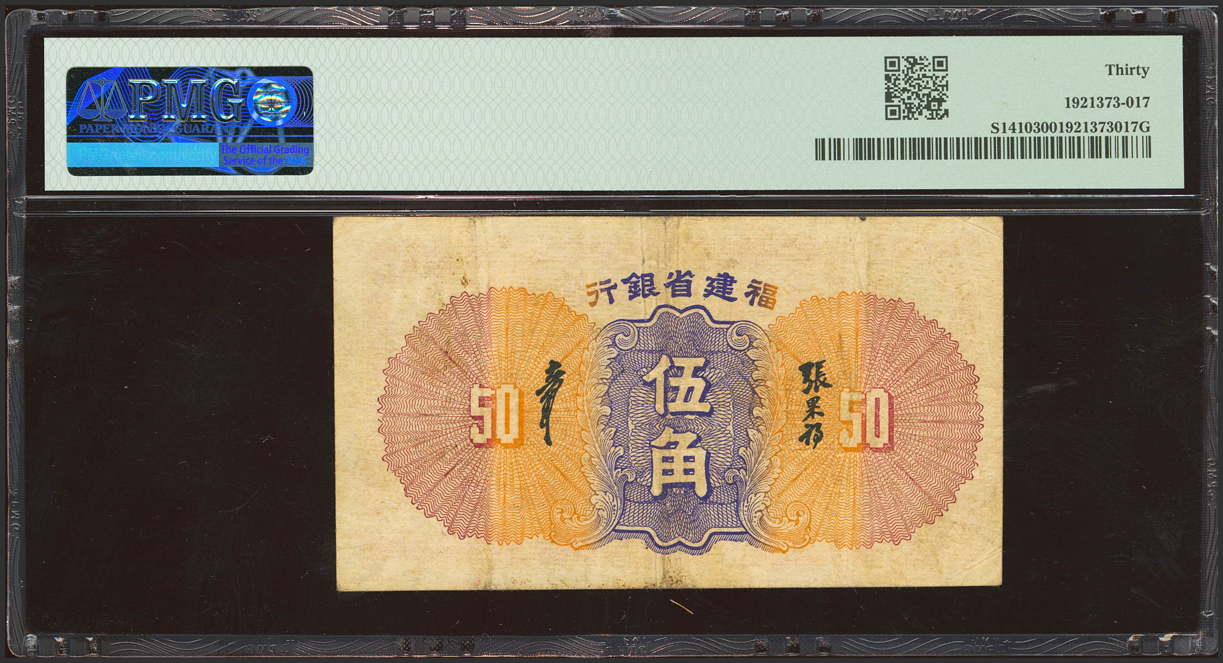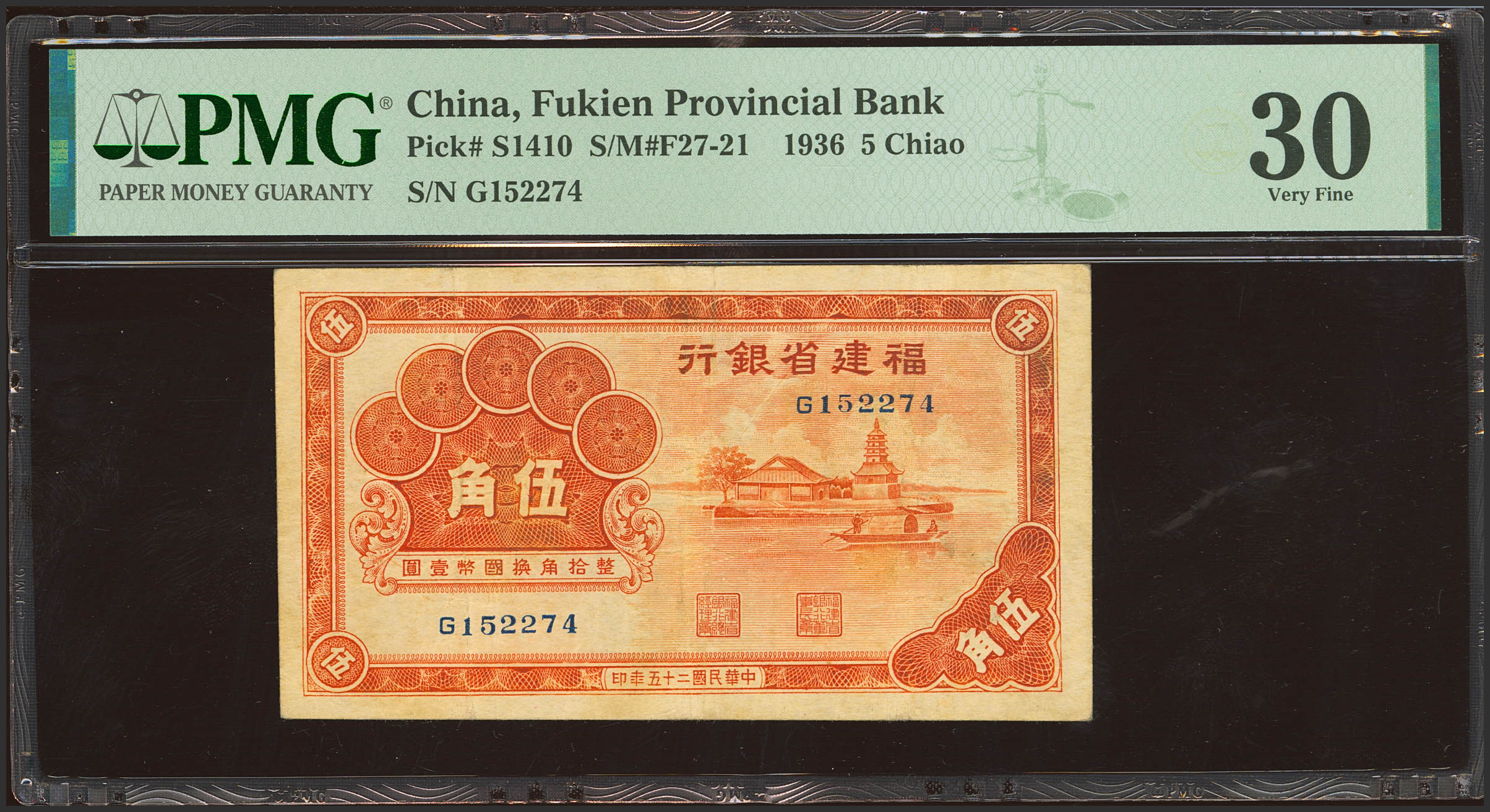 CHINA. 5 Chiao. 1936. Fukien Provincial Bank. (Pick: S1410, SM: F27-21). PMG30.