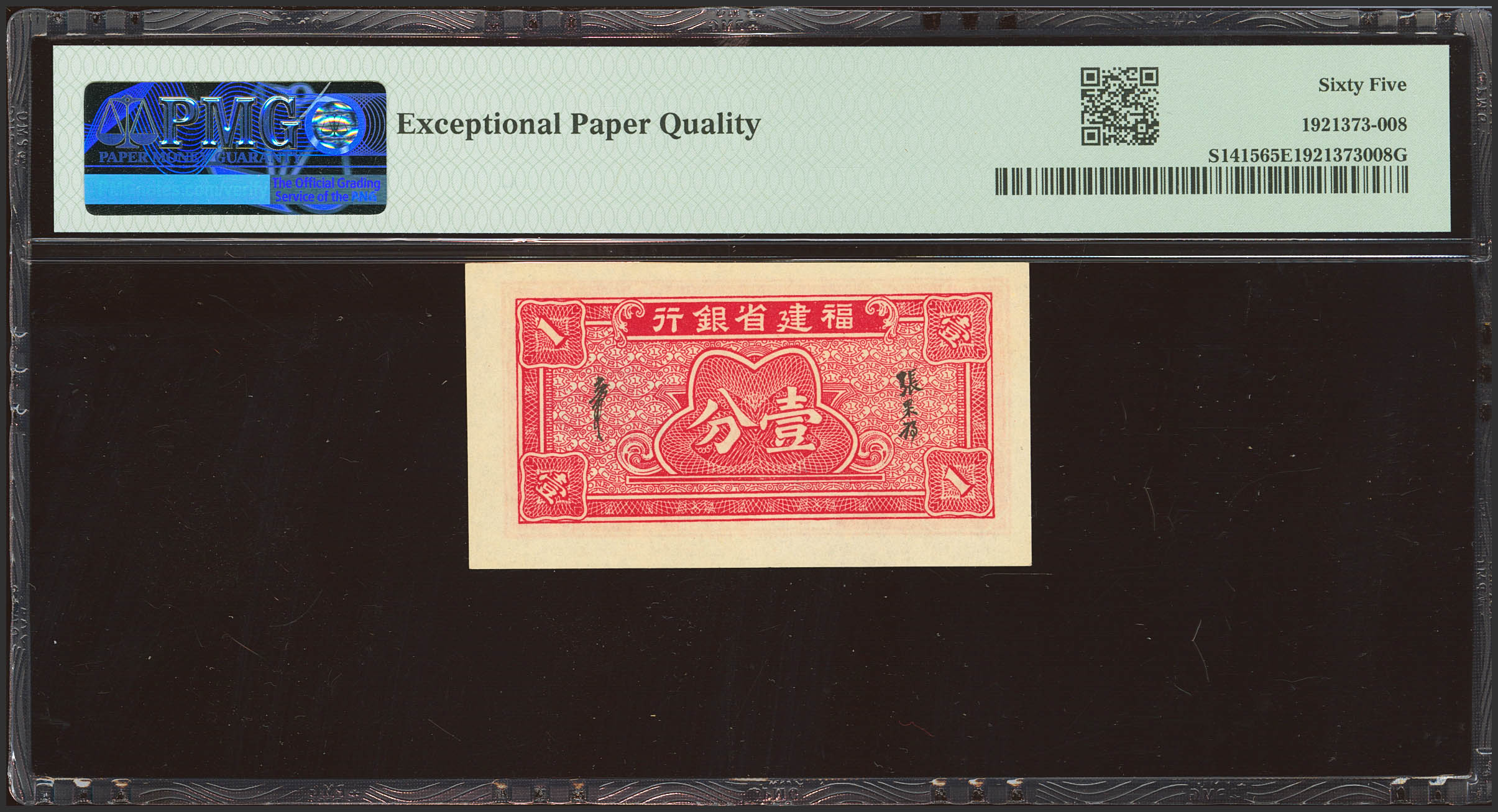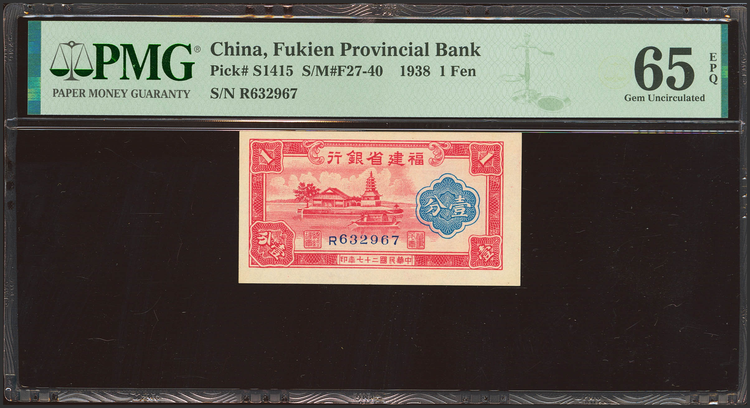 CHINA. 1 Fen. 1938. Fukien Provincial Bank. (Pick: S1415, SM: F27-40). PMG65EPQ.