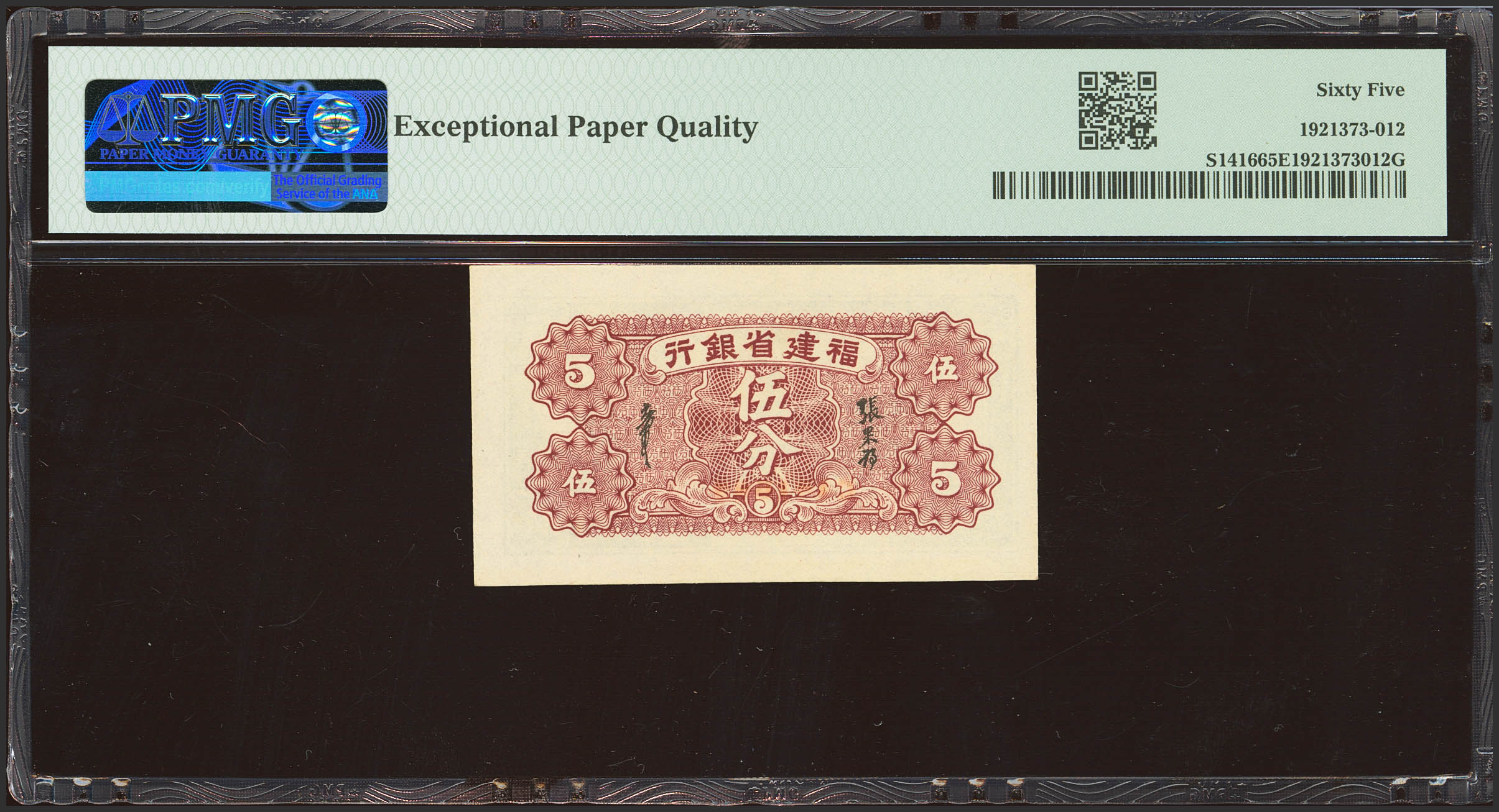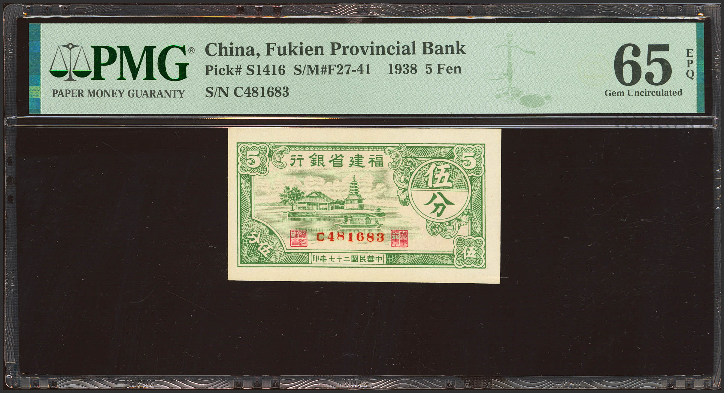 CHINA. 5 Fen. 1938. Fukien Provincial Bank. (Pick: S1416, SM: F27-41). PMG65EPQ.