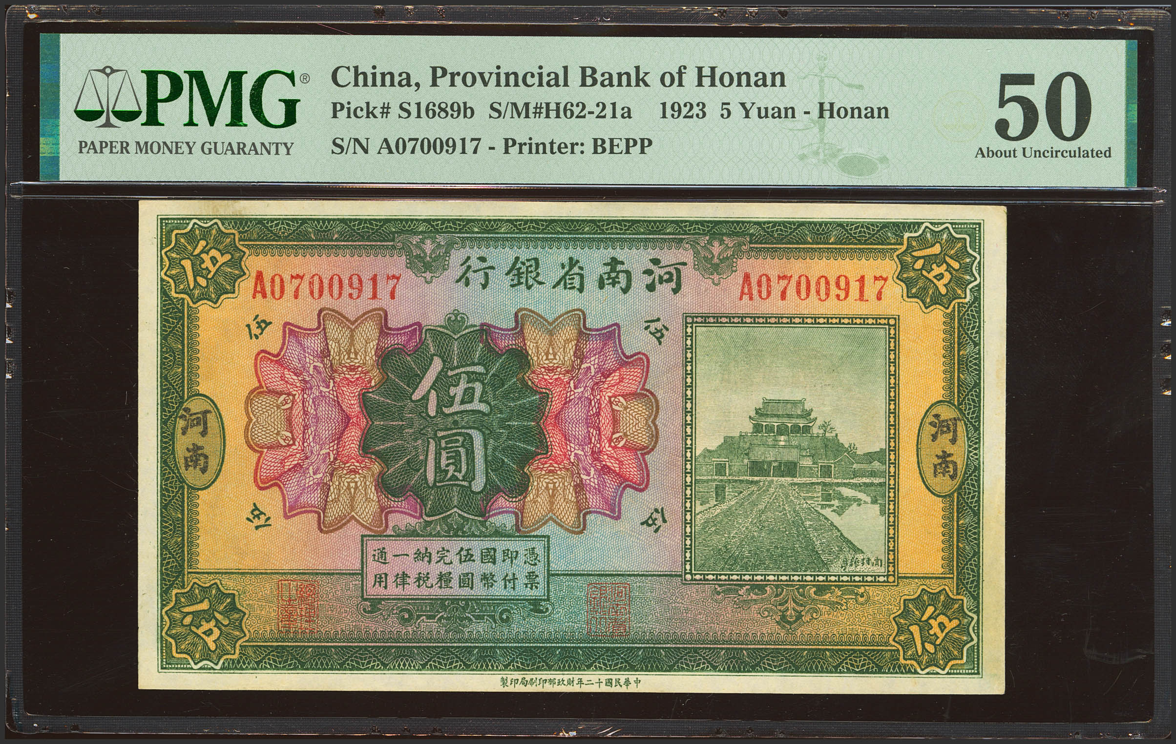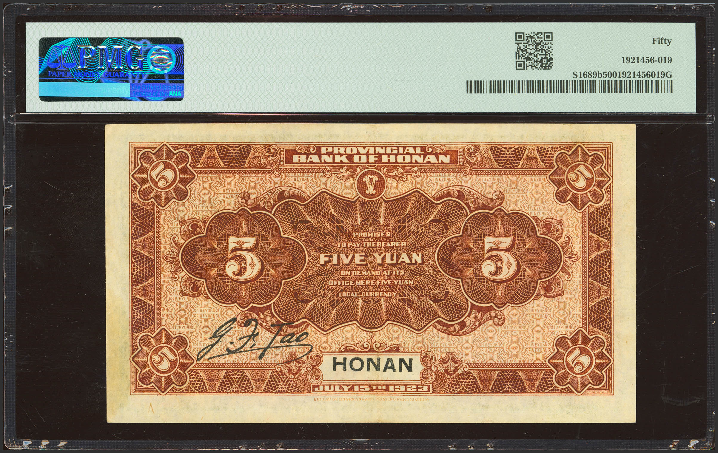 CHINA. 5 Yuan. 15 July 1923. Provincial Bank of Honan. Honan. (Pick: S1689b, SM: H62-21a). PMG50.