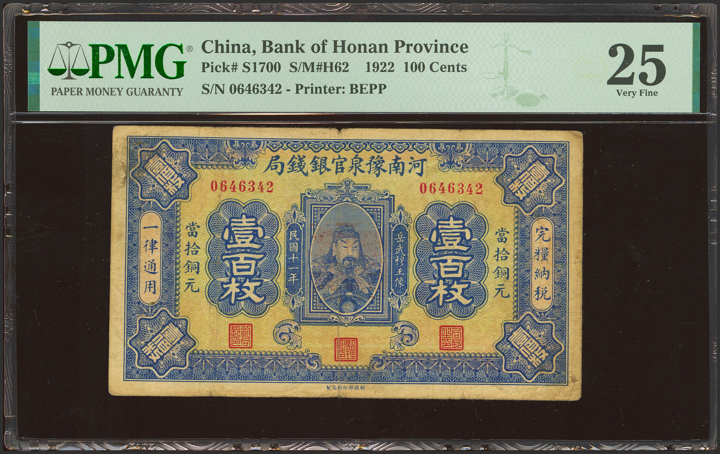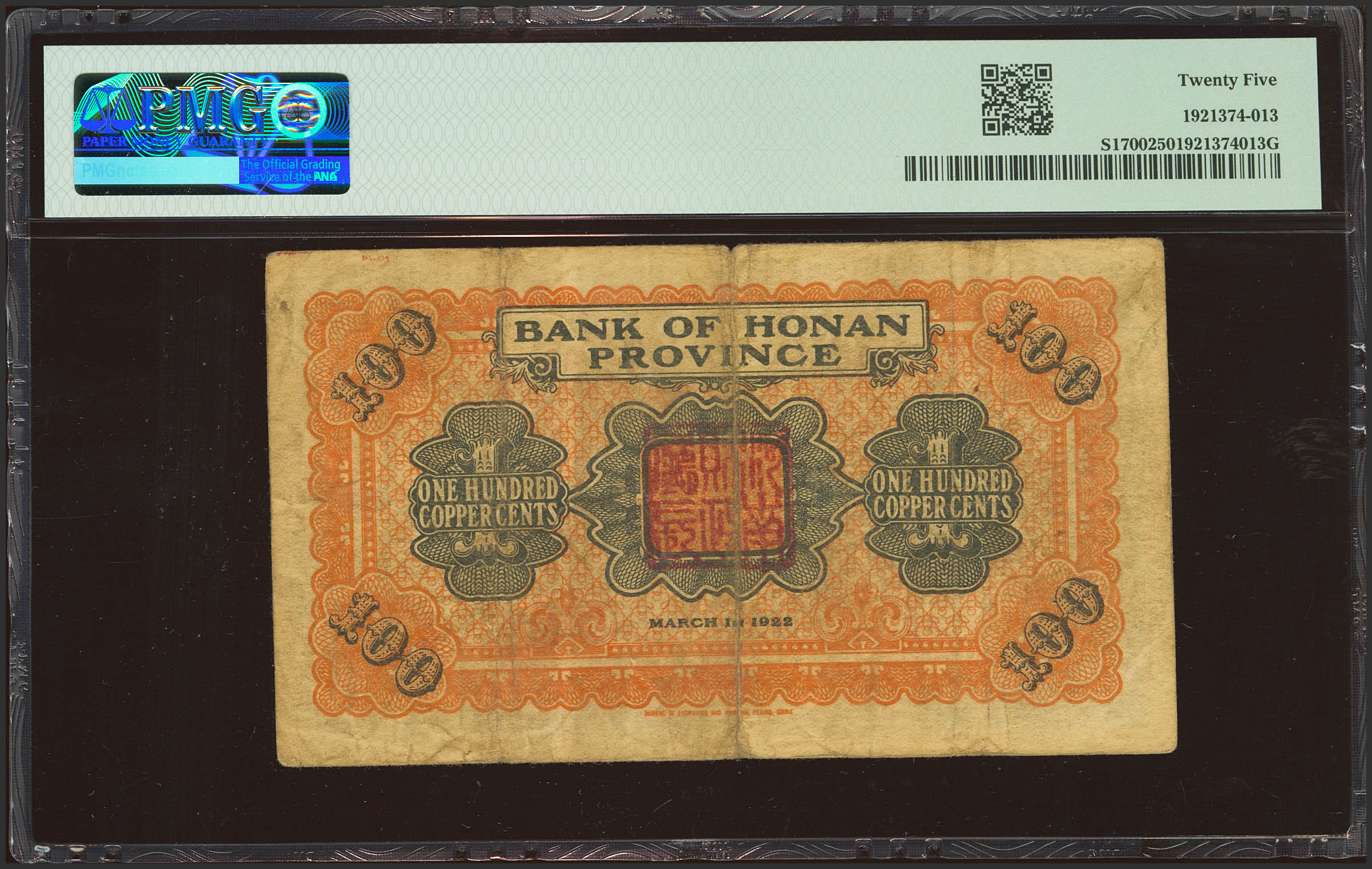 CHINA. 100 Coppers. 1 March 1922. Provincial Bank of Honan. (Pick: S1700, SM: H62). PMG25.
