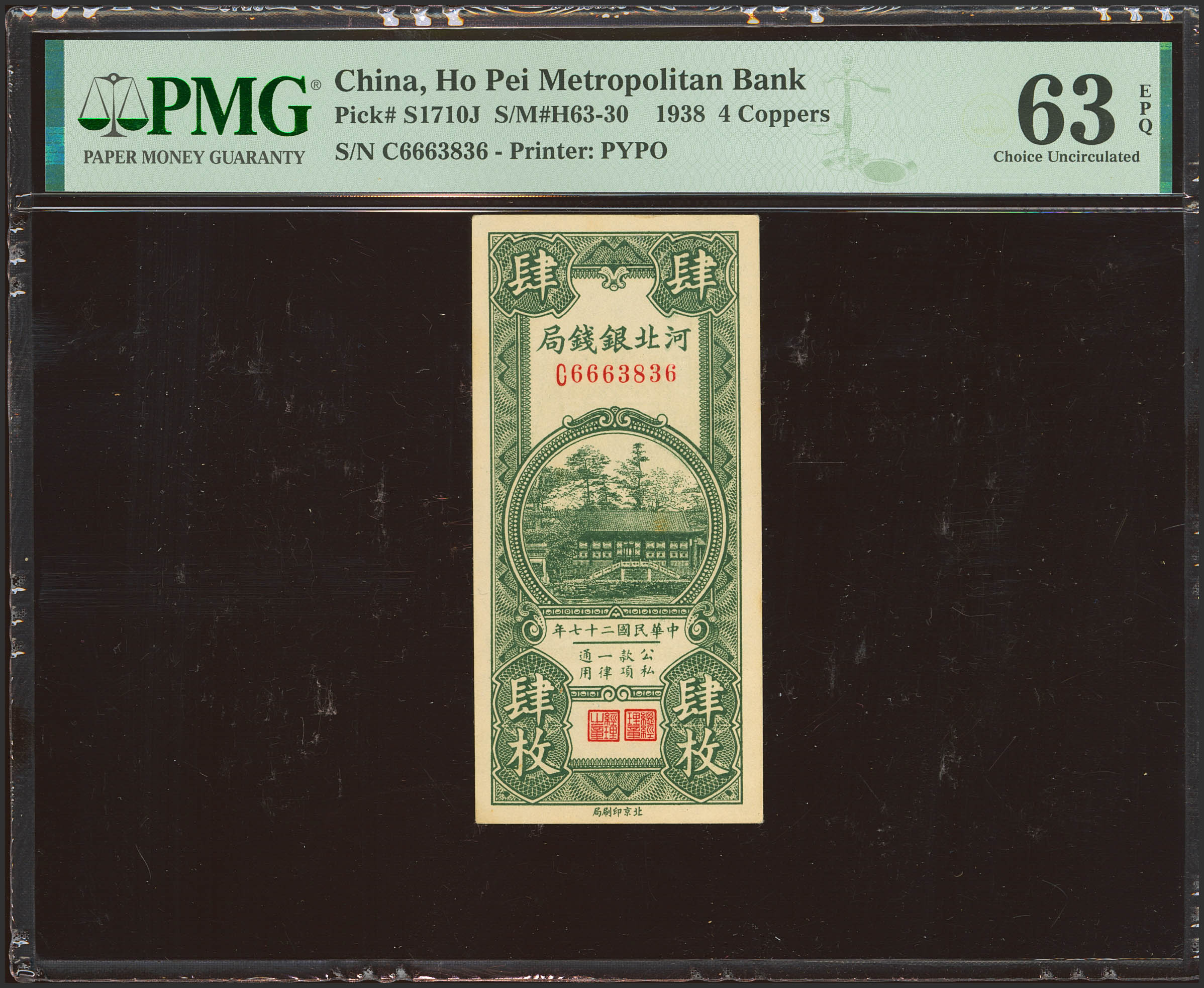 CHINA. 4 Copper. 1938. Hopei Metropolitan Bank. (Pick: S1710J, SM: H63-30). PMG63EPQ.