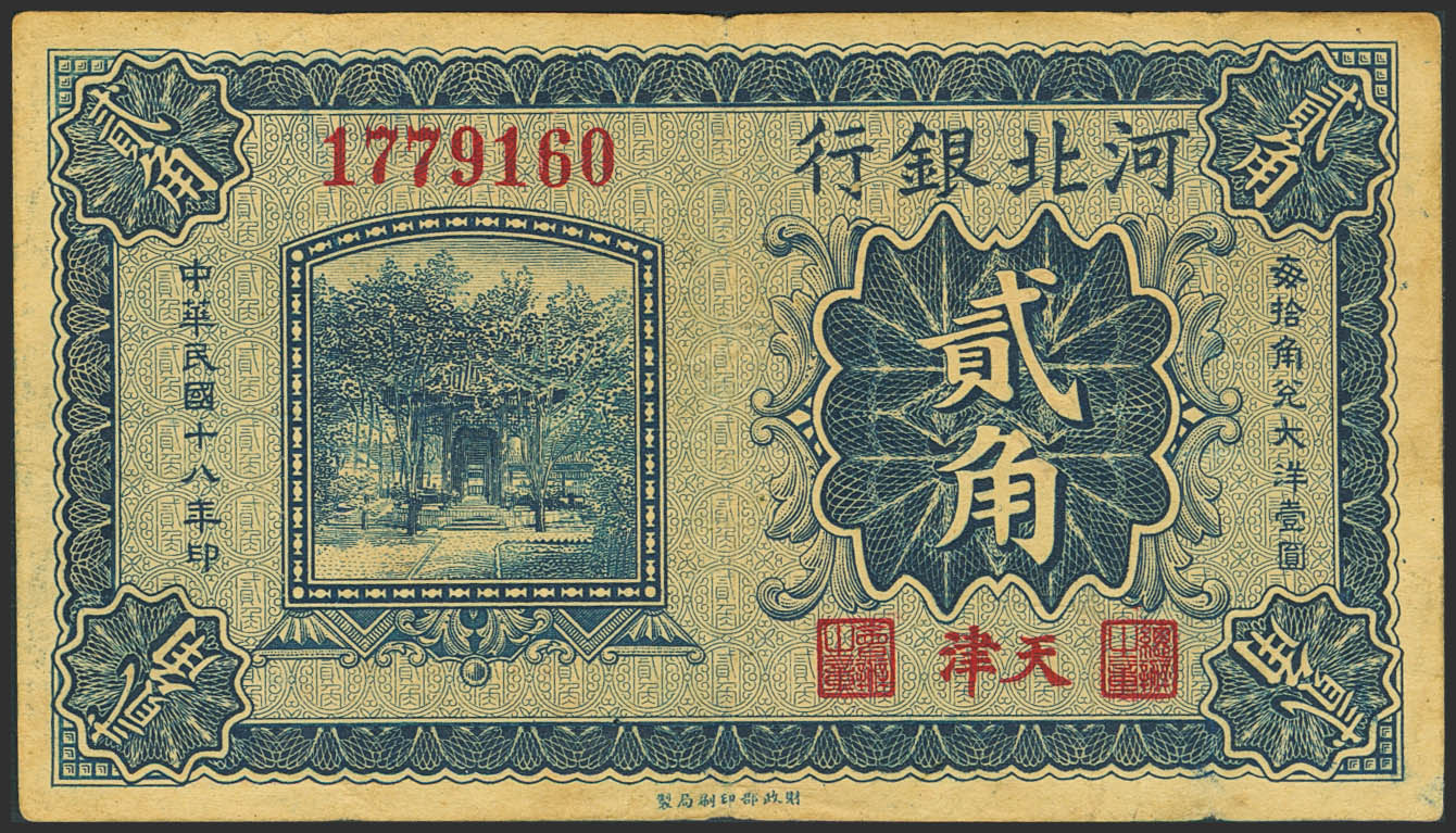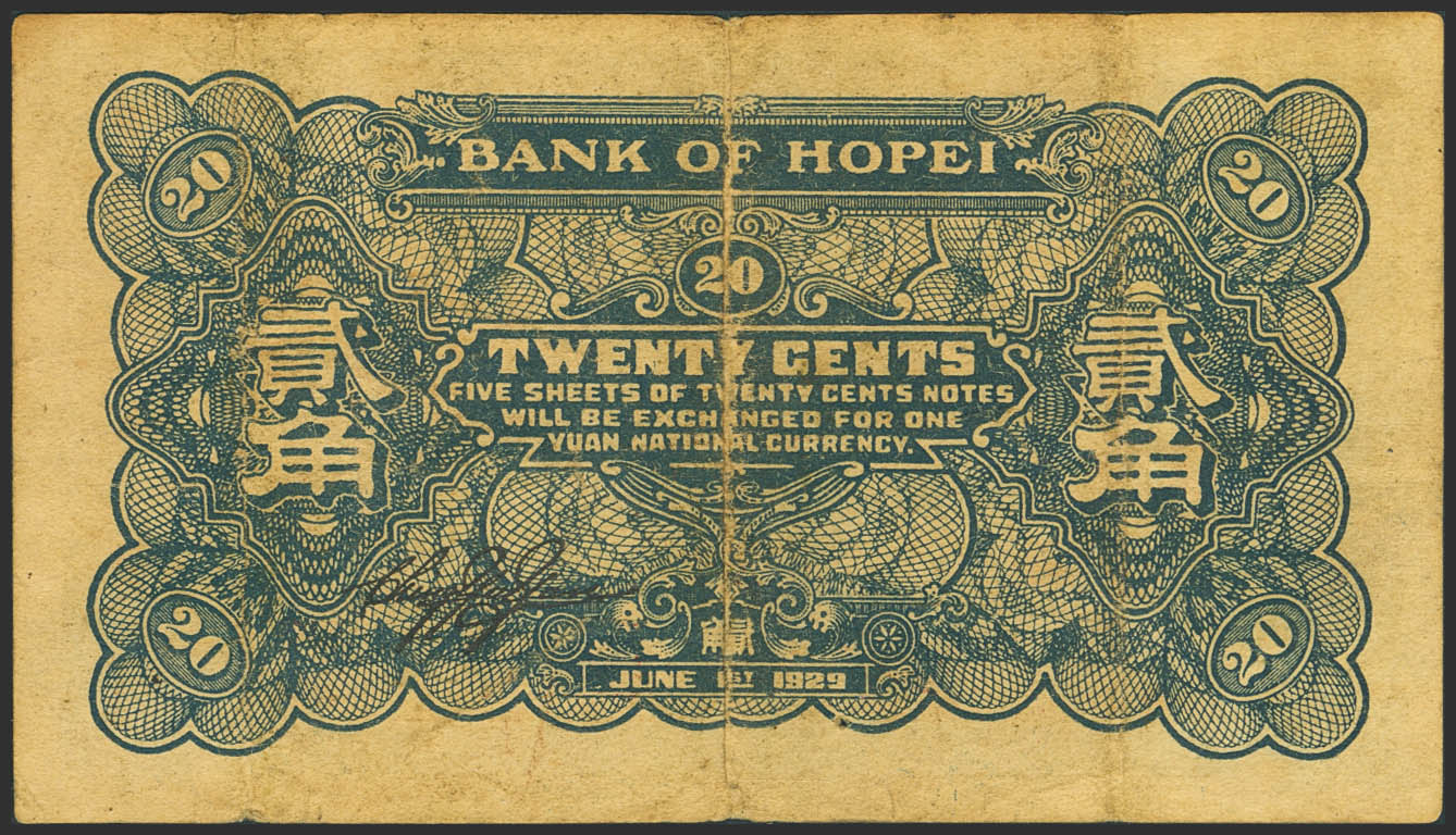 CHINA. 20 Cents. 1 June 1929. Bank of Hopei. Tientsin. (Pick: S1712b). Pinhole. More than Very Fine.