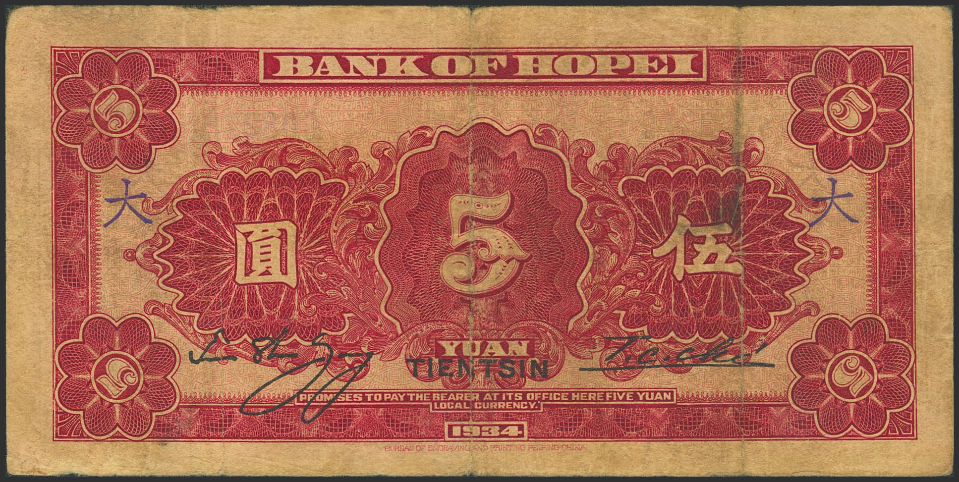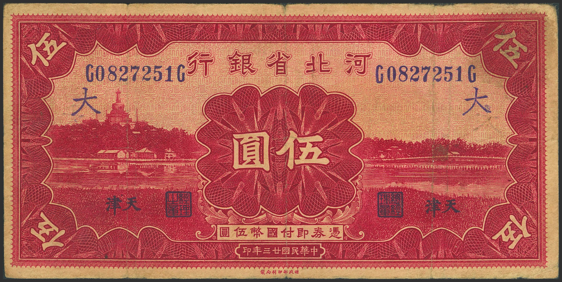 CHINA. 5 Yuan. 1934. Bank of Hopei. Tientsin. (Pick: S1731e). Very Fine.