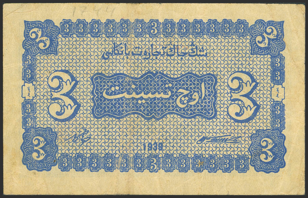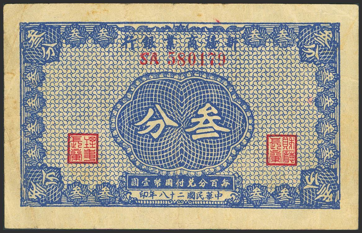 CHINA. 3 Fen. 1939. Sinkiang Commercial and Industrial Bank. (Pick: S1744). More than Very Fine.