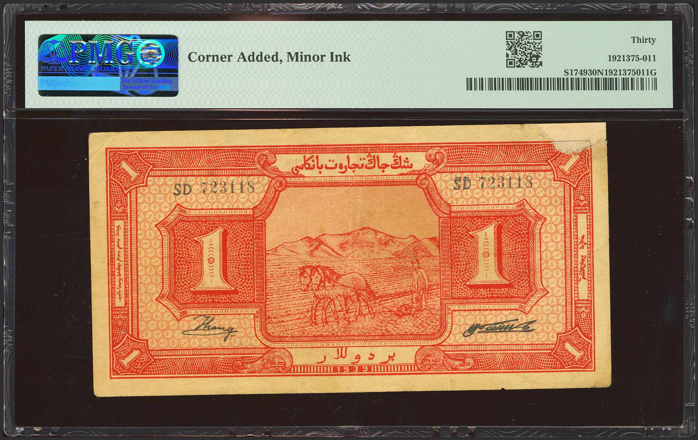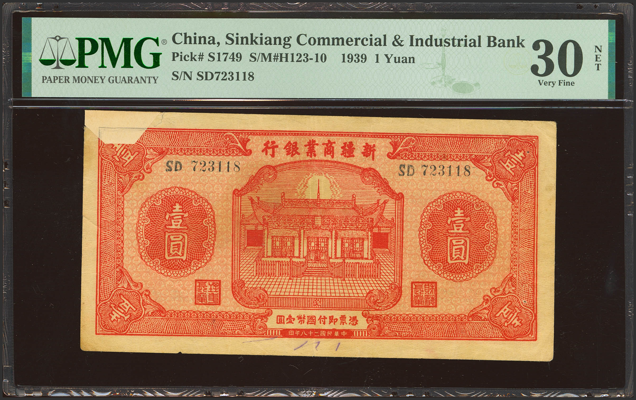 CHINA. 1 Yuan. 1939. Sinkiang Commercial and Industrial Bank. (Pick: S1749, SM: H123-10). The upper left corner is missing, adhesive paper has been applied to cover the area. PMG30NET (corner added, minor ink).
