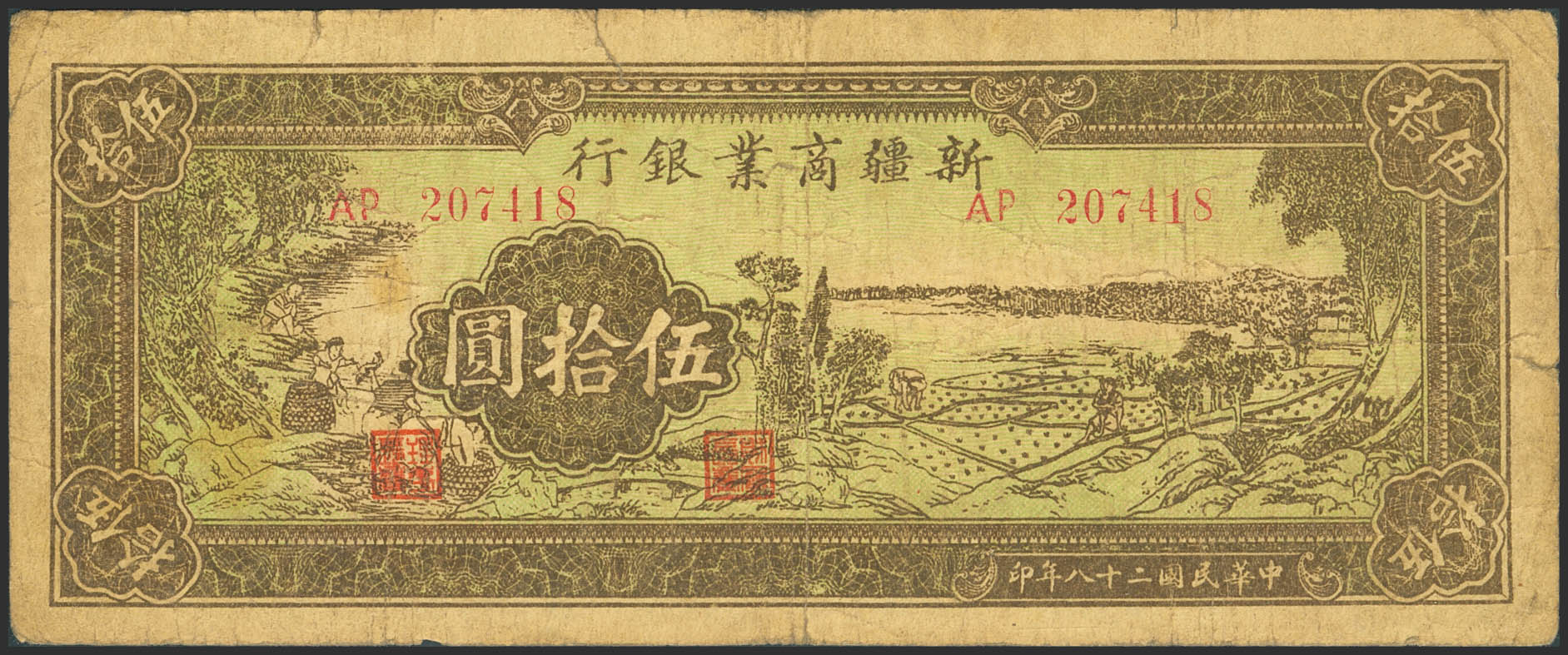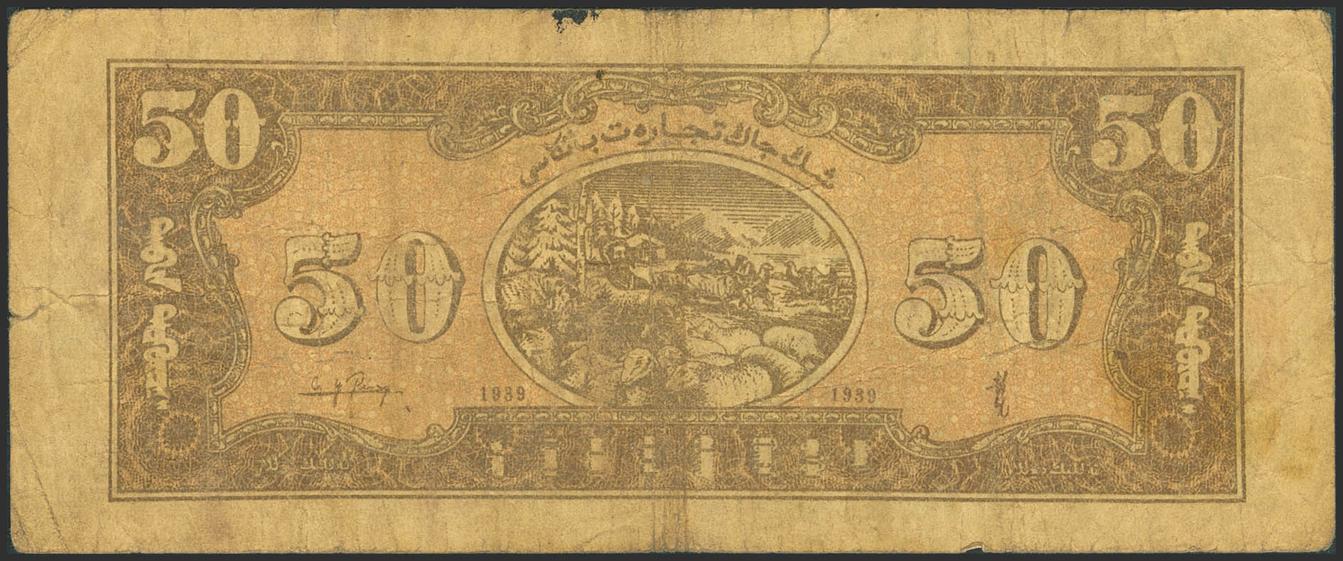 CHINA. 50 Yuan. 1939. Sinkiang Commercial and Industrial Bank. (Pick: S1753). Cuts around the edge. Fine.