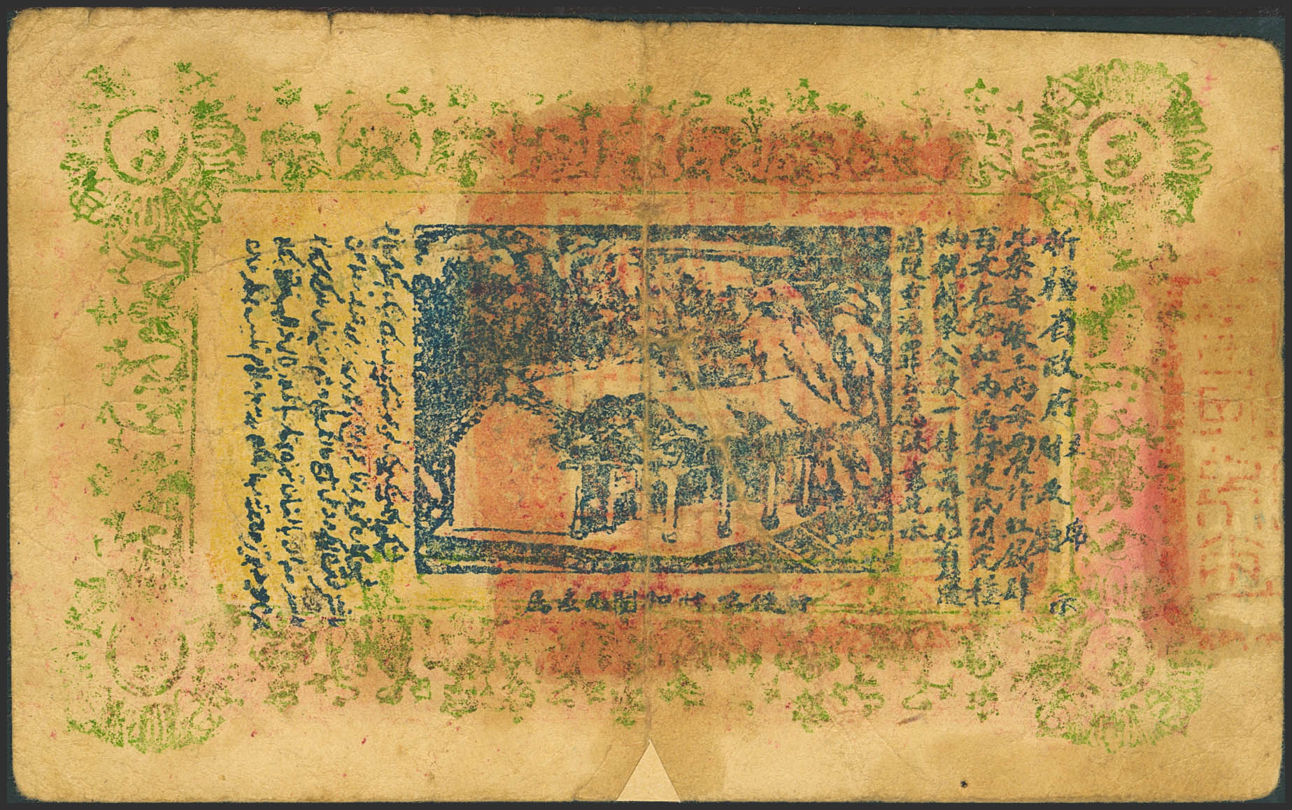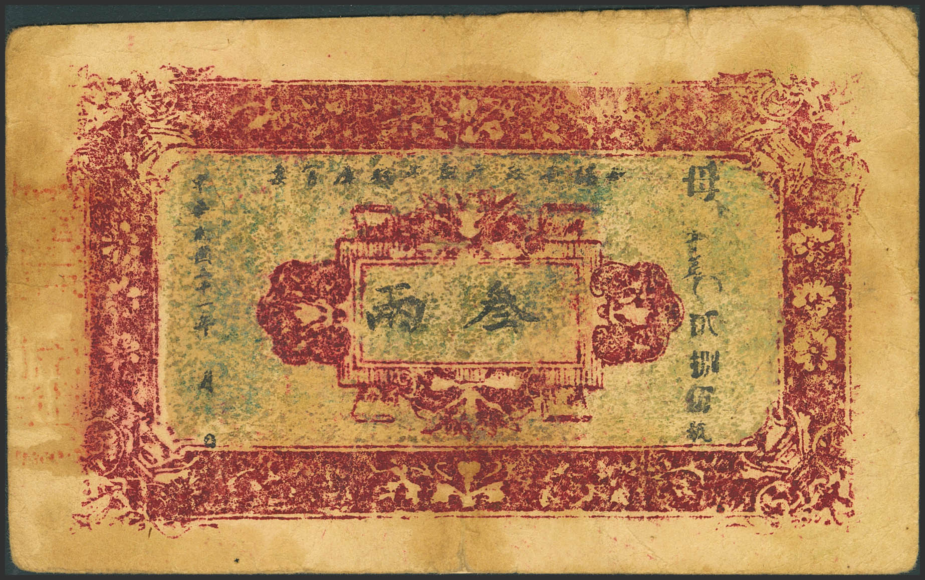 CHINA. 3 Taels. 1932. Sinkiang Sub-Prefecture Administration Finance Department Treasury. (Pick: S1779). Tear in the center. More than Fine.
