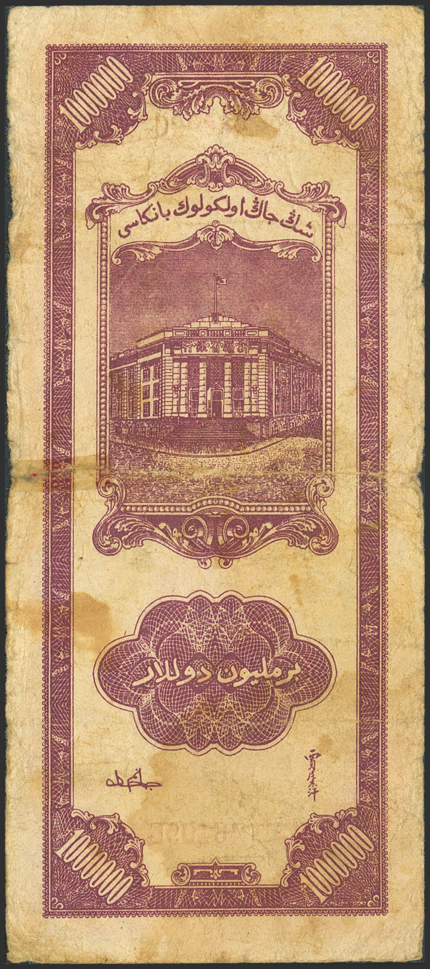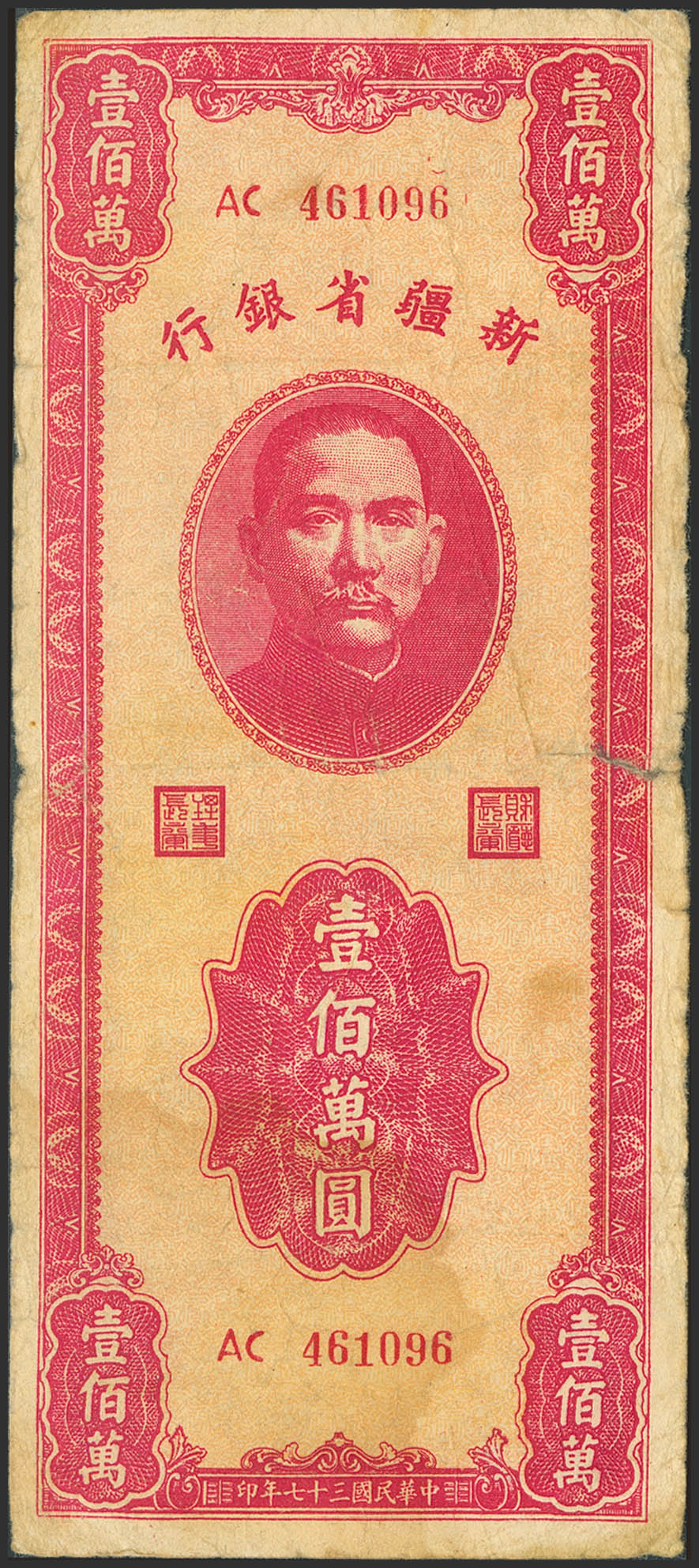 CHINA. 1000000 Yuan. 1948. Sinkiang Provincial Bank. (Pick: S1786). Tape added to the upper cut of the central fold. Fine.