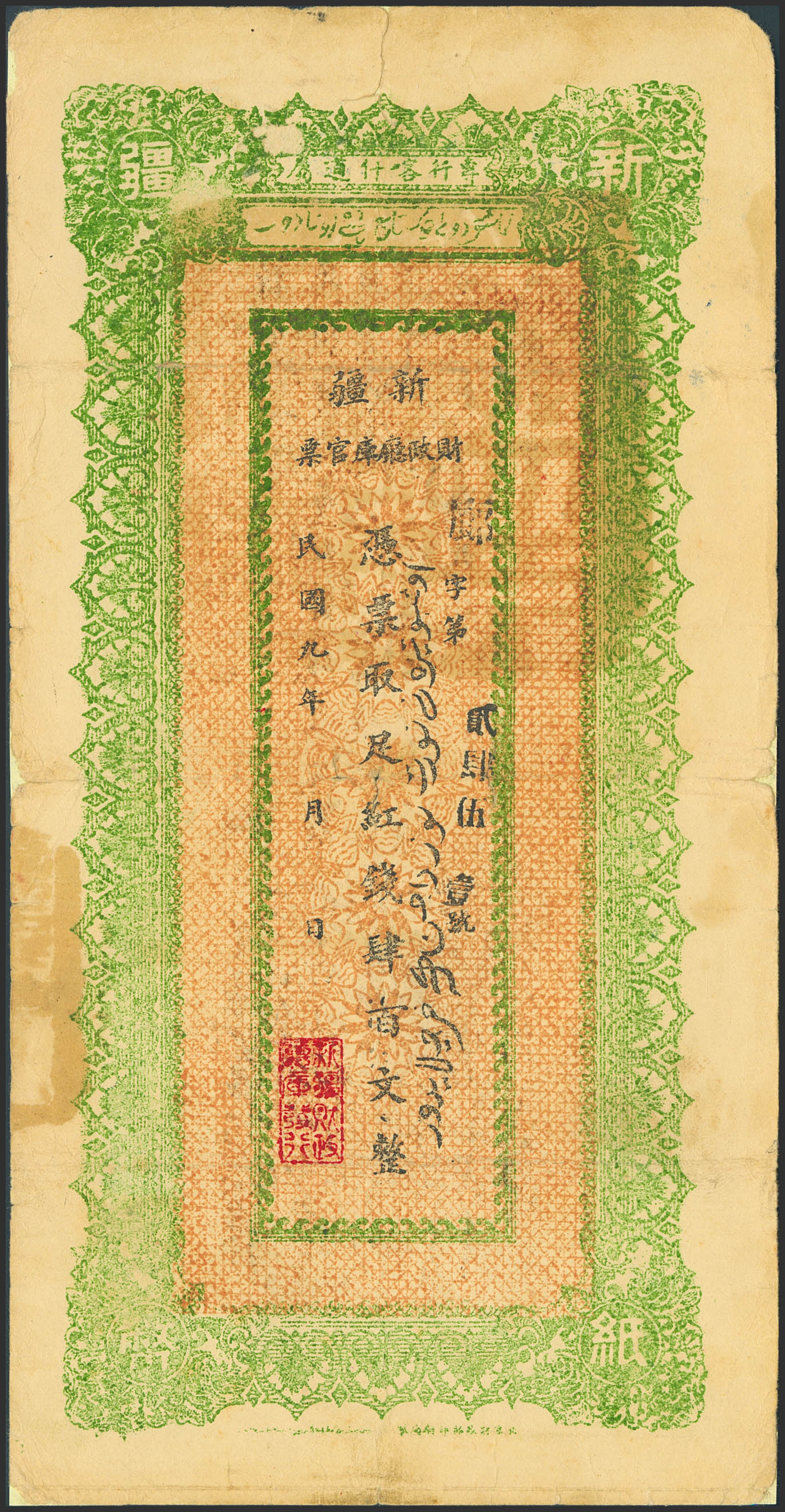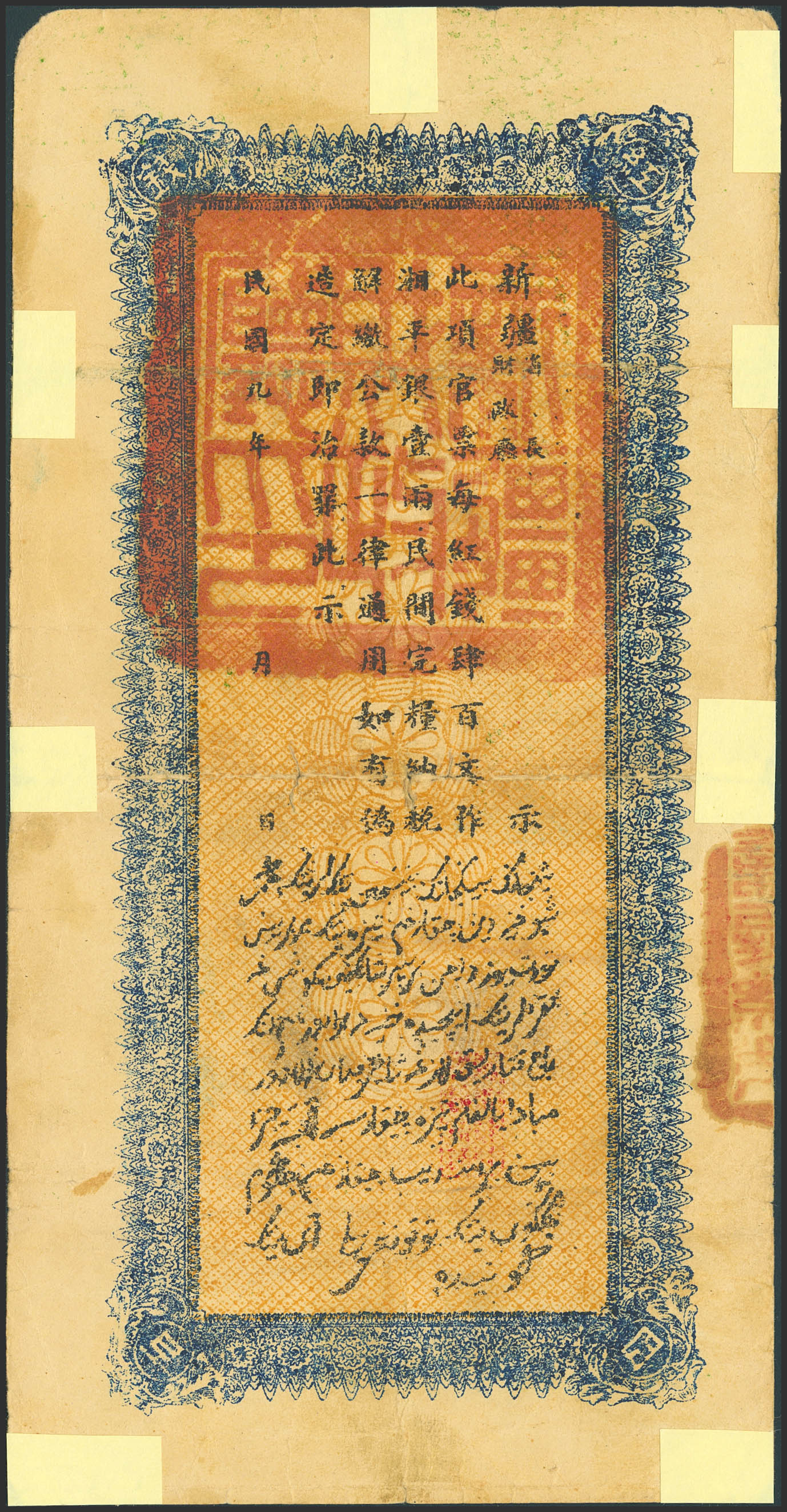 CHINA. 400 Cash. 1920. Sinkiang Sub-Prefecture Administration Finance Department Treasury. (Pick: S1822a). Removable adhesive paper added over tears. More than Fine.