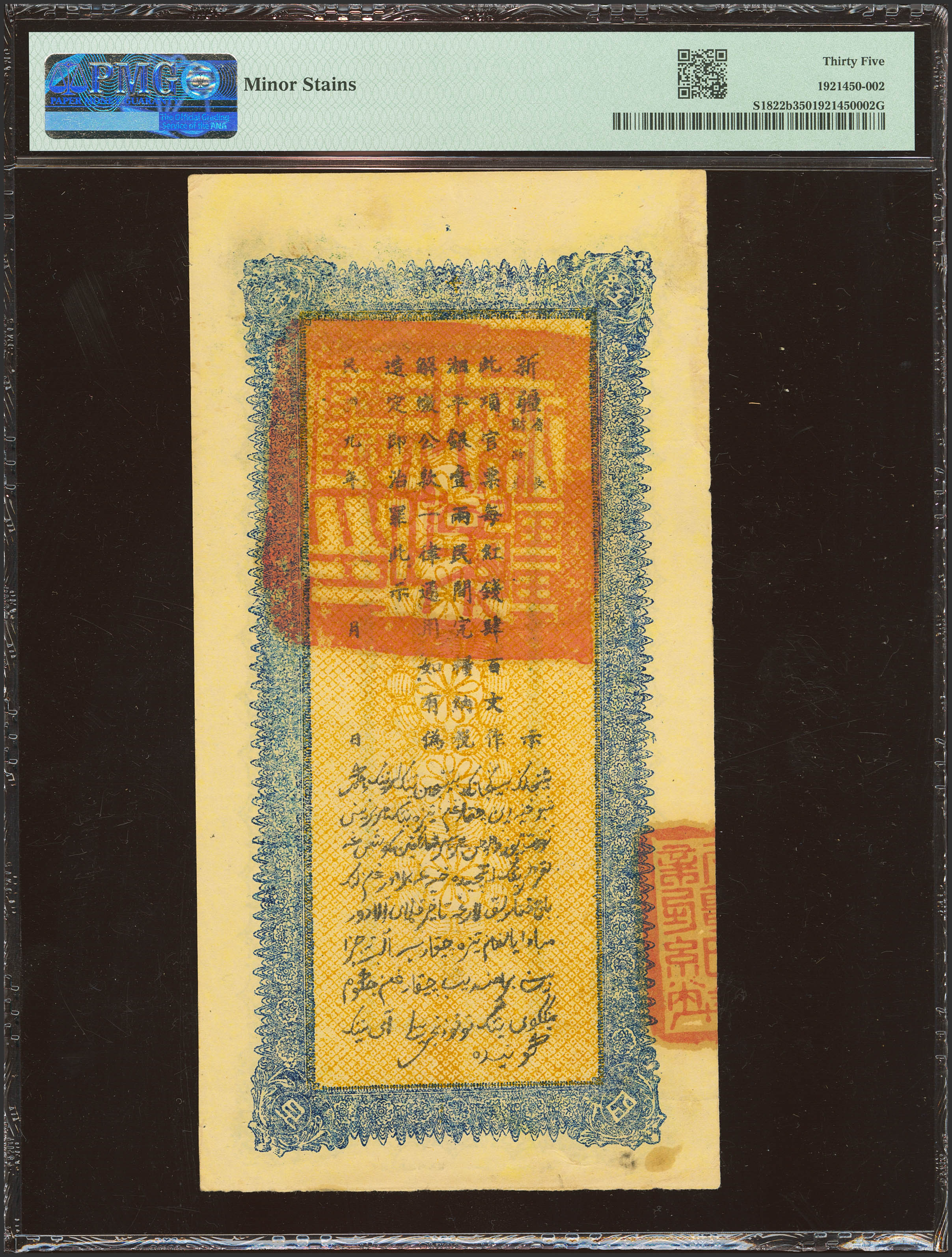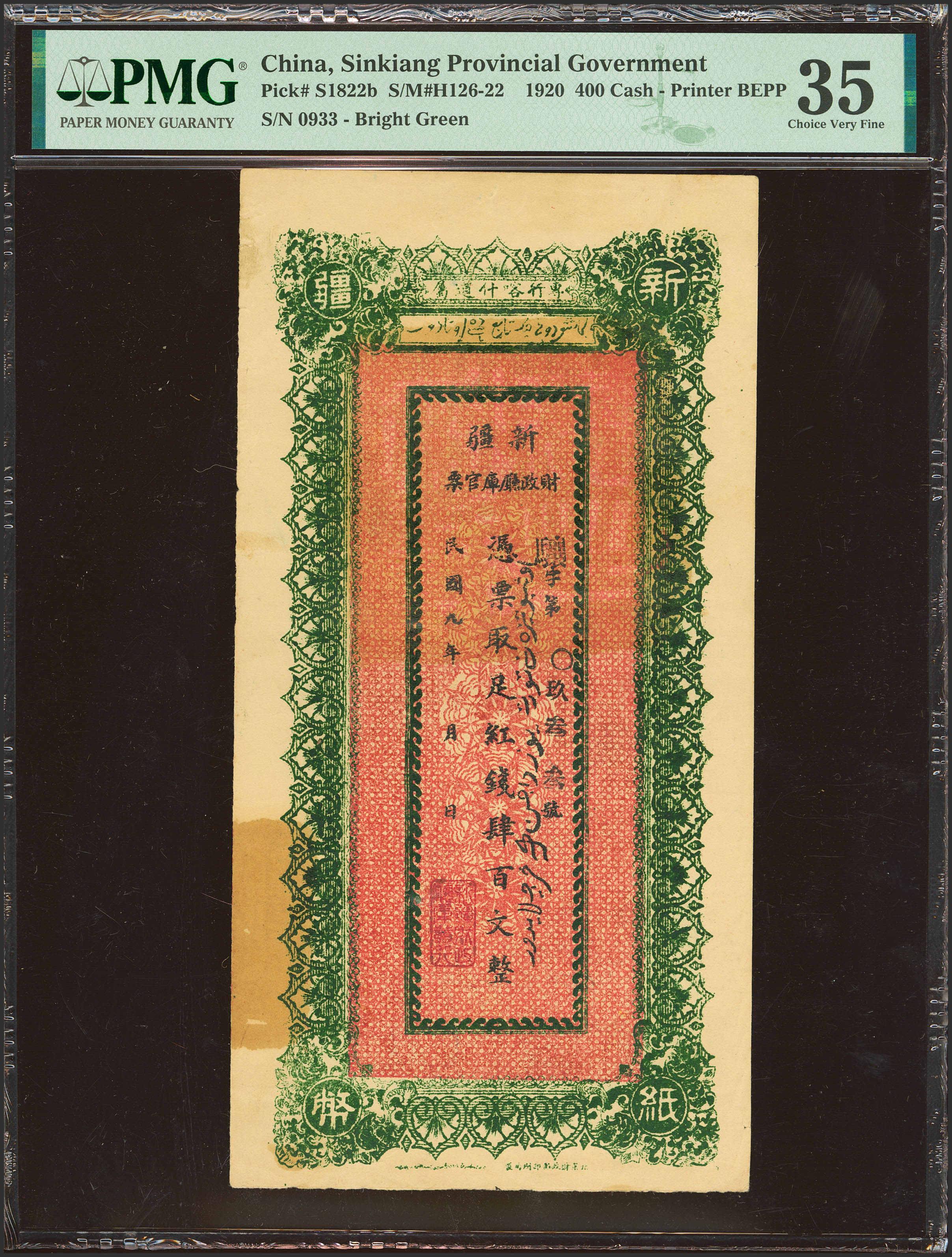 CHINA. 400 Cash. 1920. Sinkiang Sub-Prefecture Administration Finance Department Treasury. (Pick: S1822b, SM: H126-22). PMG35 (minor stains).