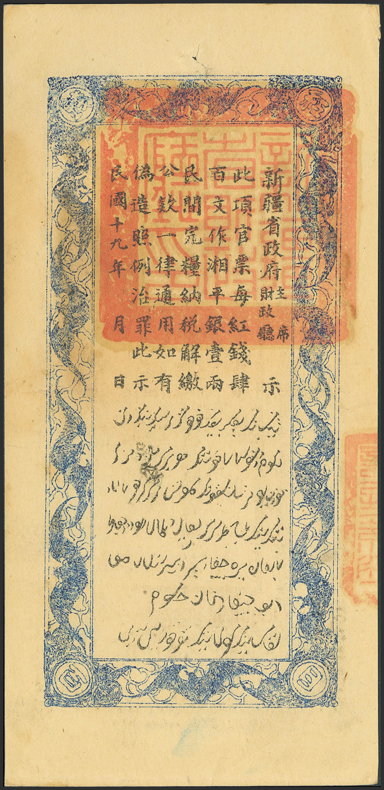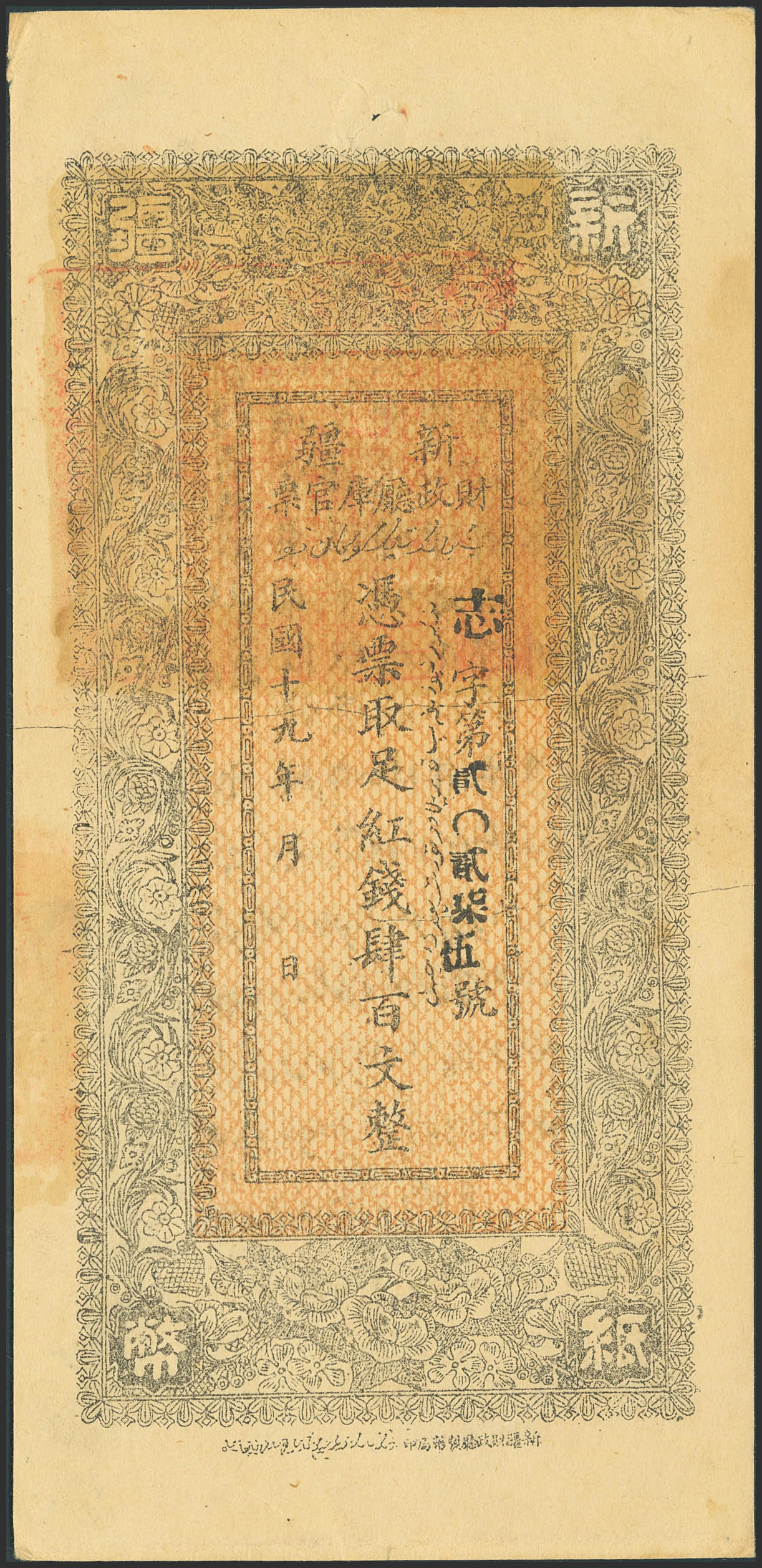 CHINA. 400 Cash. 1930. Sinkiang Sub-Prefecture Administration Finance Department Treasury. (Pick: S1844). Spindle hole. Almost Uncirculated.