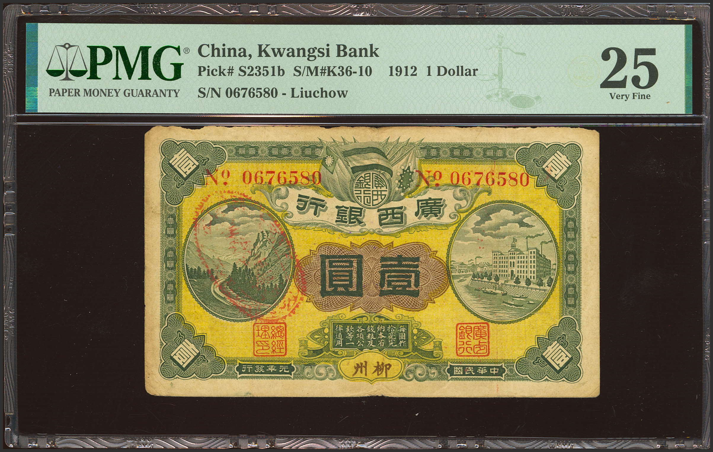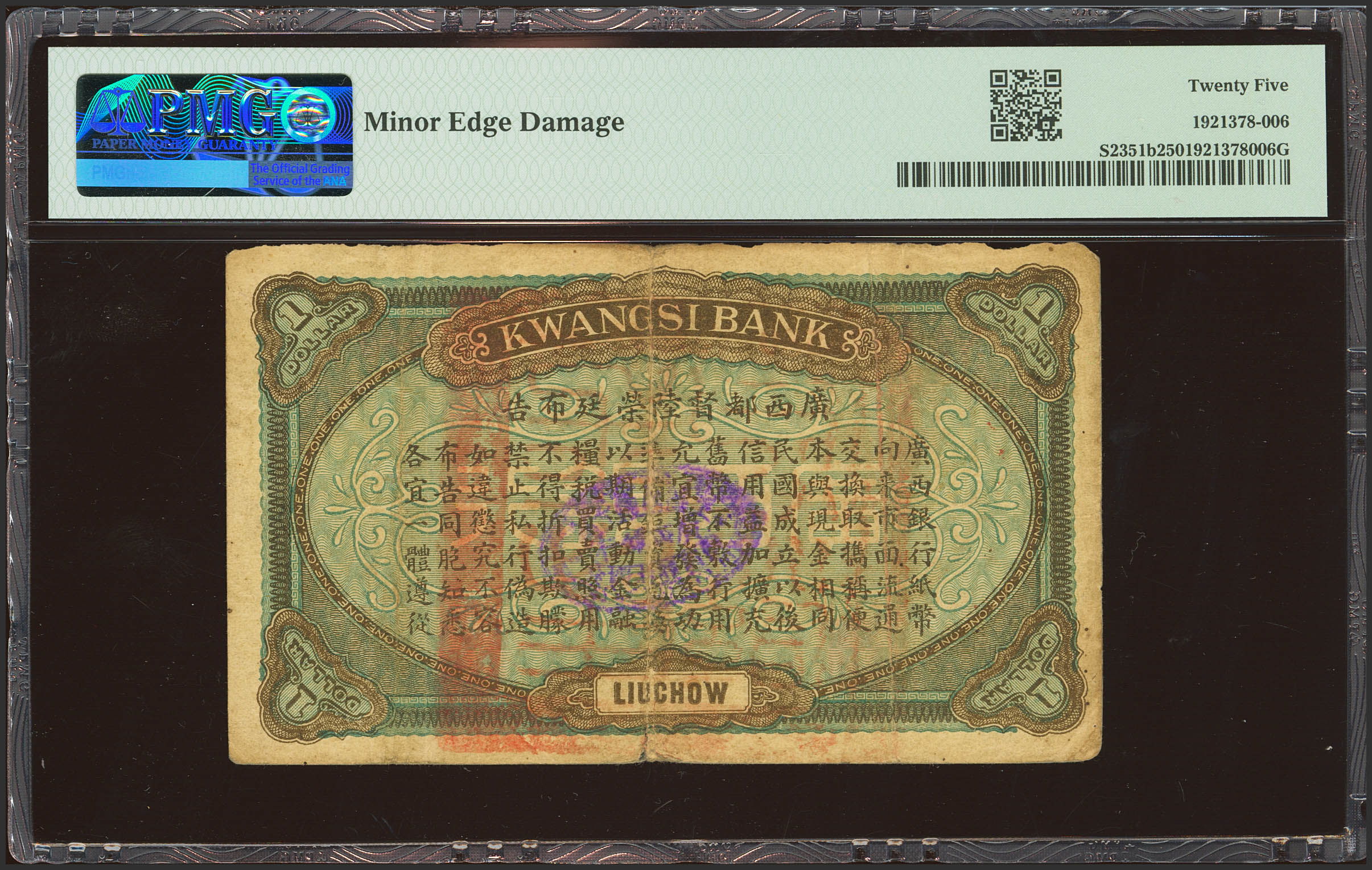 CHINA. 1 Dollar. 1912. Kwangsi Bank. Liuchow. (Pick: S2351b, SM: K36-10). PMG25 (minor edge damage).