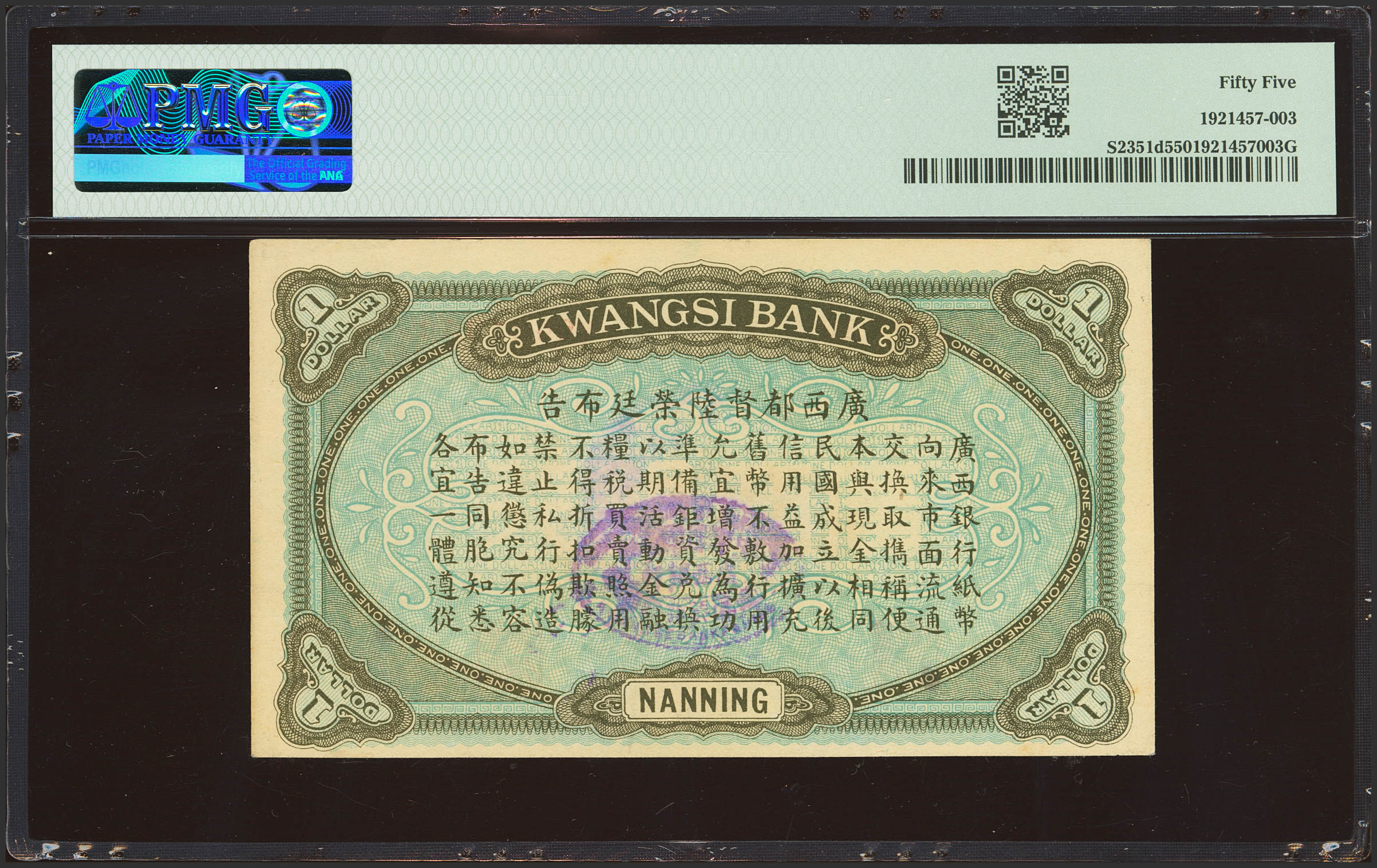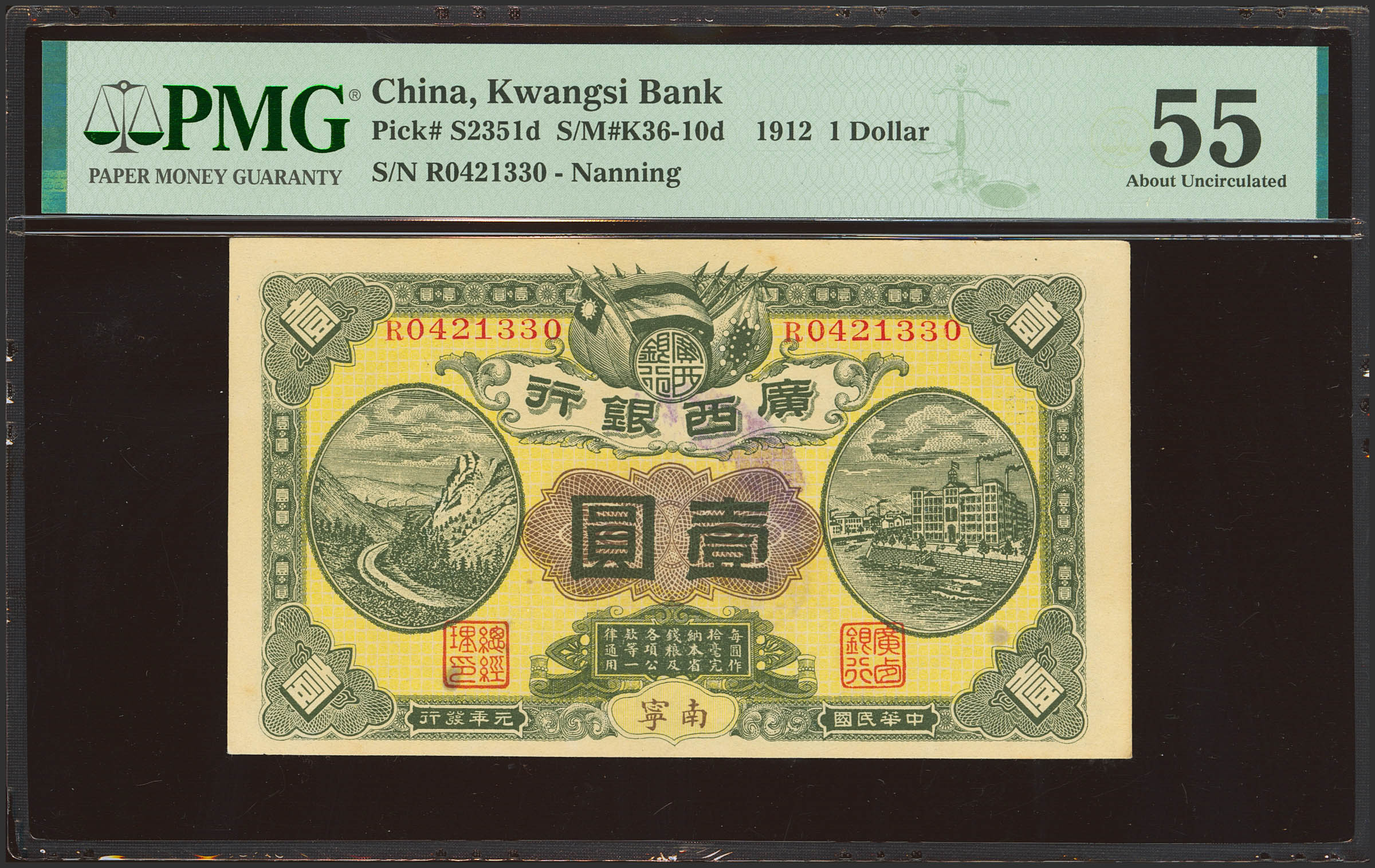 CHINA. 1 Dollar. 1912. Kwangsi Bank. Nanning. (Pick: S2351d, SM: K36-10d). PMG55.