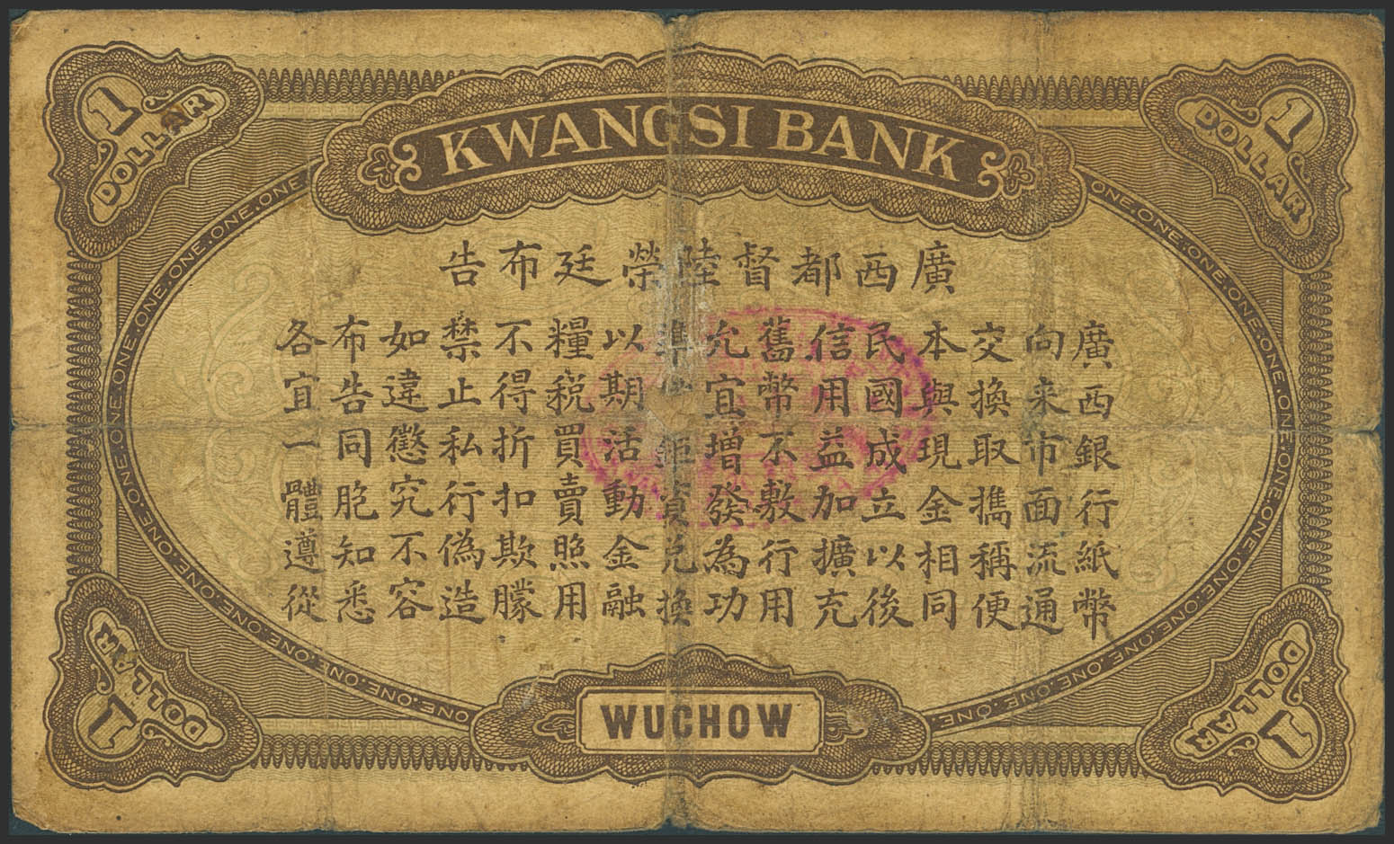 CHINA. 1 Dollar. 1912. Kwangsi Bank. Wuchow. (Pick: S2351e). Tears. More than Fine.