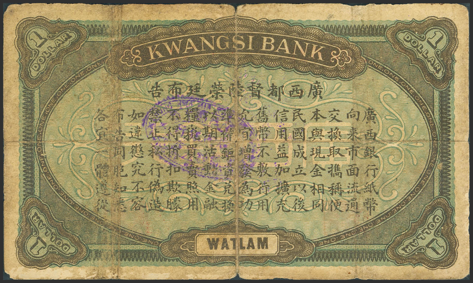 CHINA. 1 Dollar. 1912. Kwangsi Bank. Watlam. (Pick: S2351f). Tears. Pinhole. Very Fine.