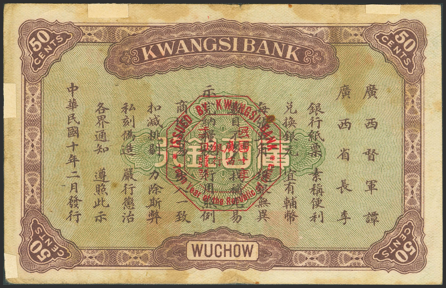 CHINA. 50 Cents. 1921. Kwangsi Bank. Wuchow. (Pick: S2365). Adhesive paper added to small nibbles on the margin. More than Very Fine.