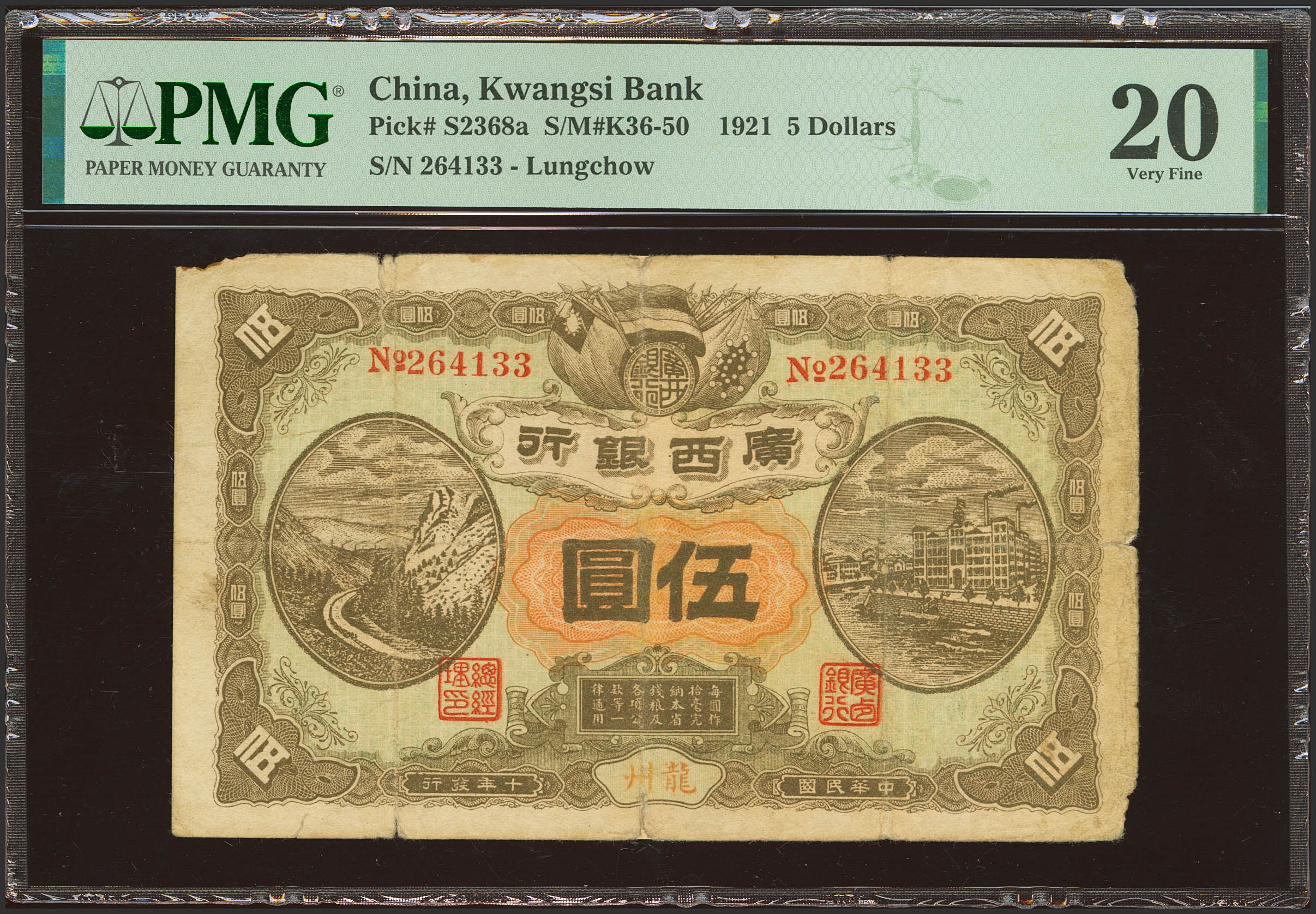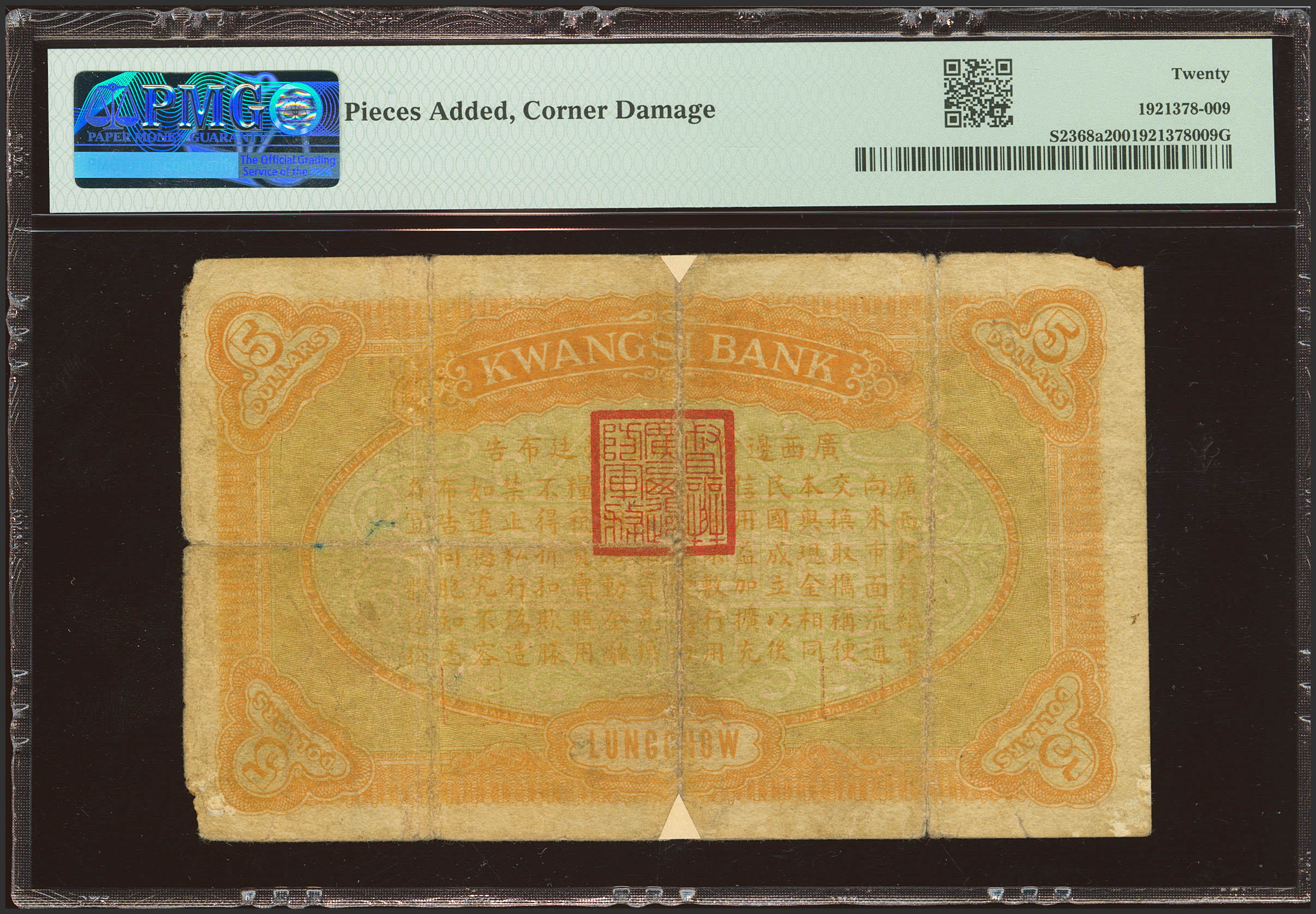 CHINA. 5 Dollars. 1921. Kwangsi Bank. Lungchow. (Pick: S2368, SM: K36-50). PMG20 (pieces added, corner damage).