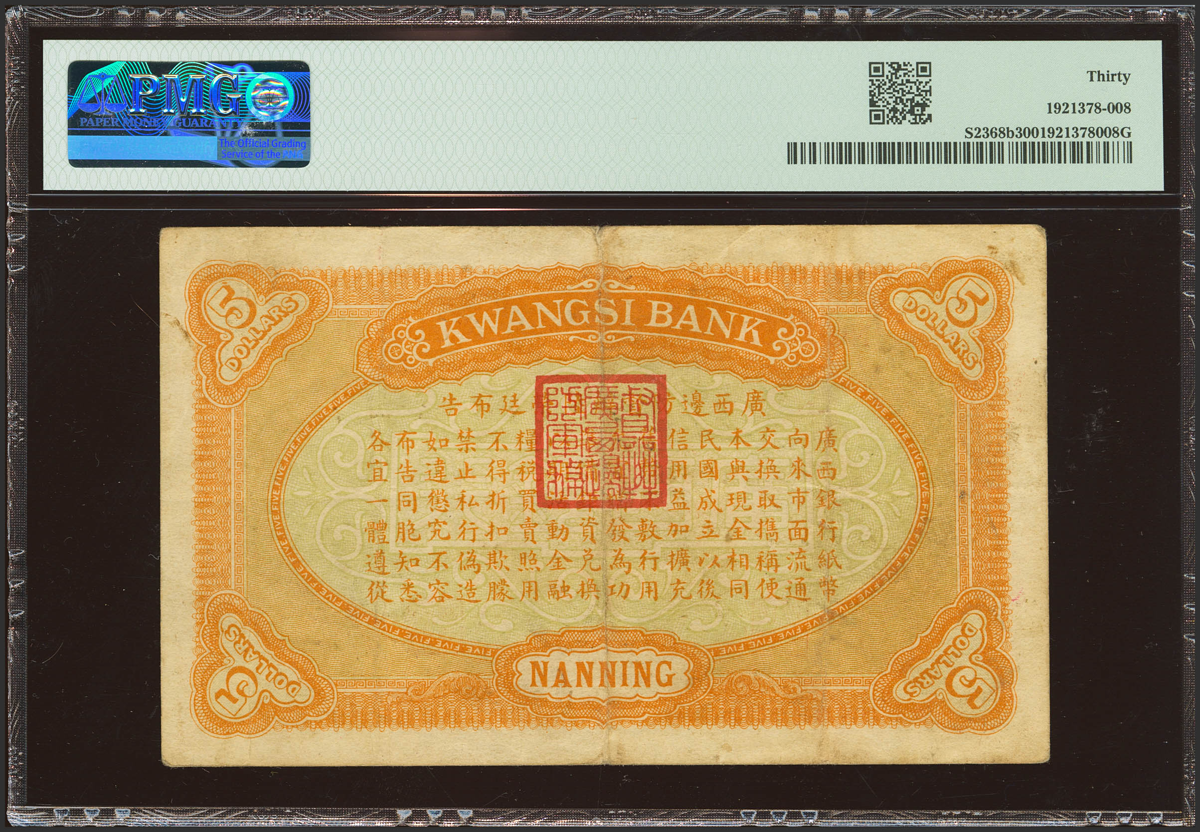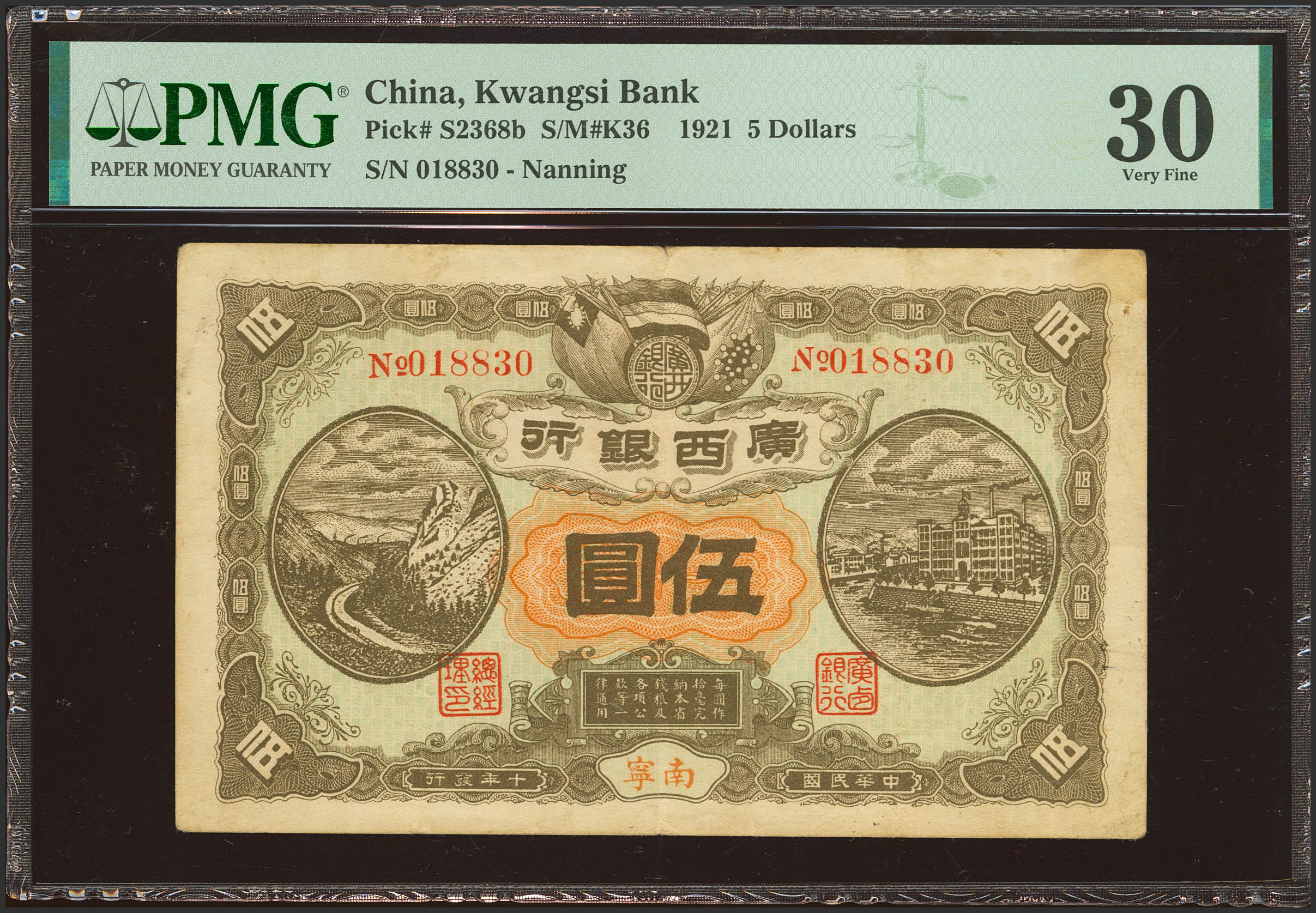 CHINA. 5 Dollars. 1921. Kwangsi Bank. Nanning. (Pick: S2368, SM: K36). PMG30.