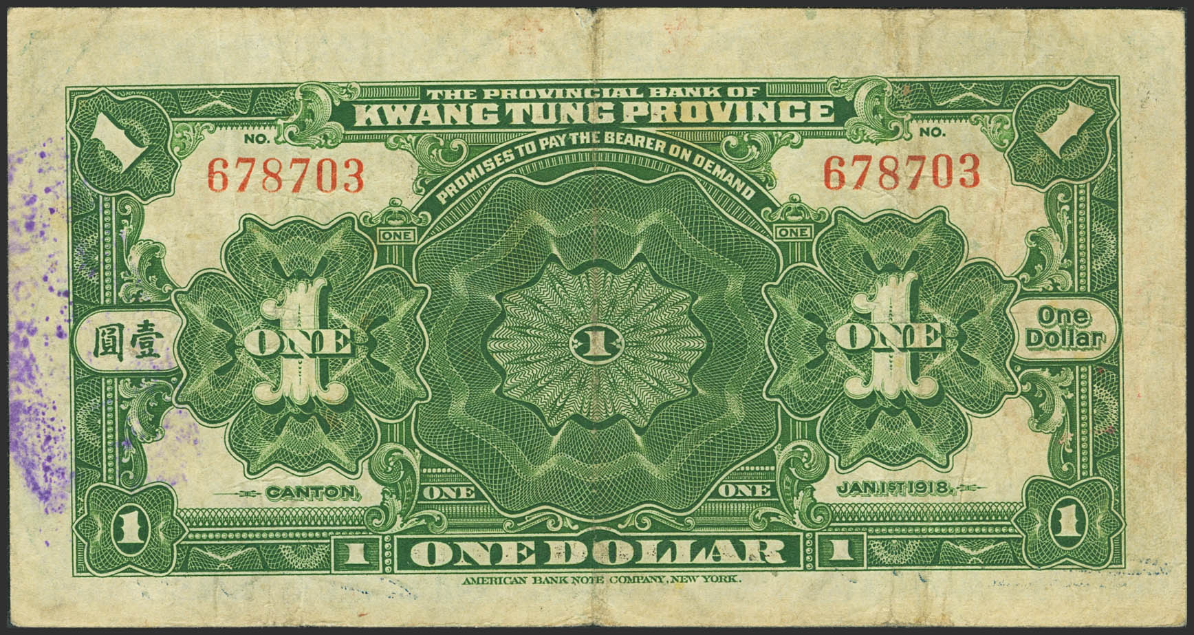 CHINA. 1 Dollar. 1 January 1918. Kwangtung Provincial Bank. Red hexagonal seal at left. Black overprint at center front. (Pick: S2401f). More than Fine.
