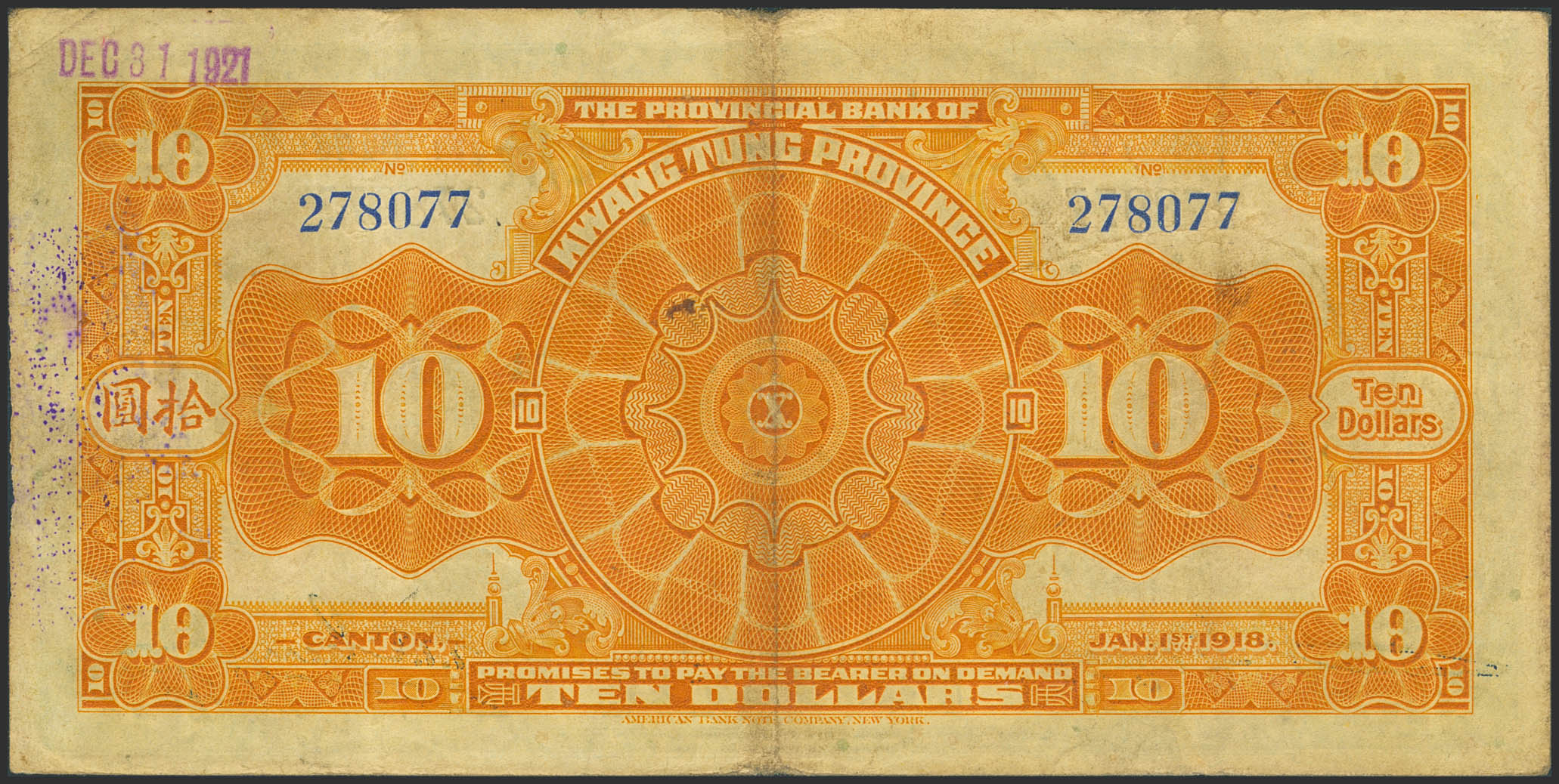 CHINA. 10 Dollars. 1 January 1918. Kwangtung Provincial Bank. Large chinese “7” in date. (Pick: S2403c). Extremely Fine.
