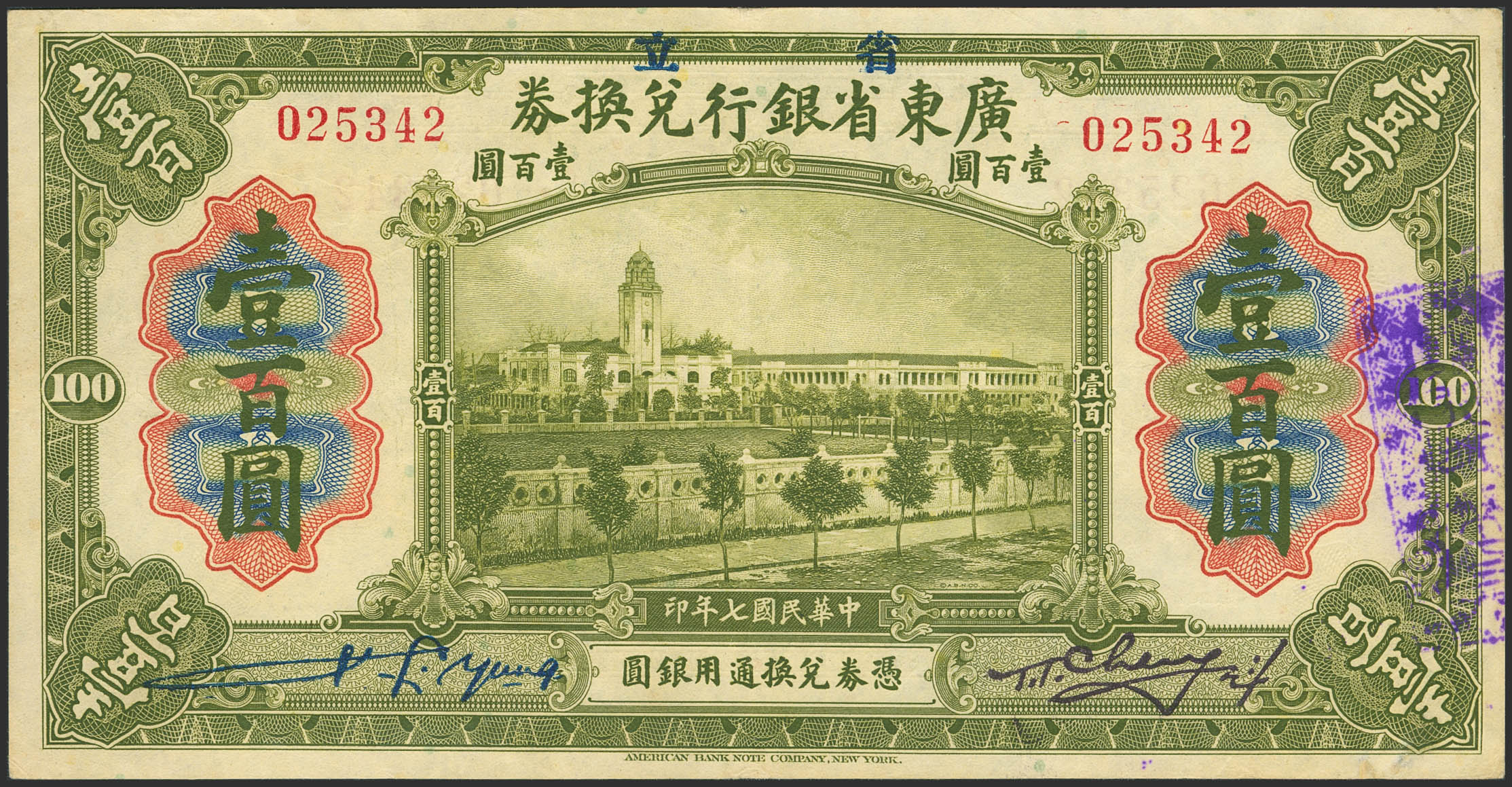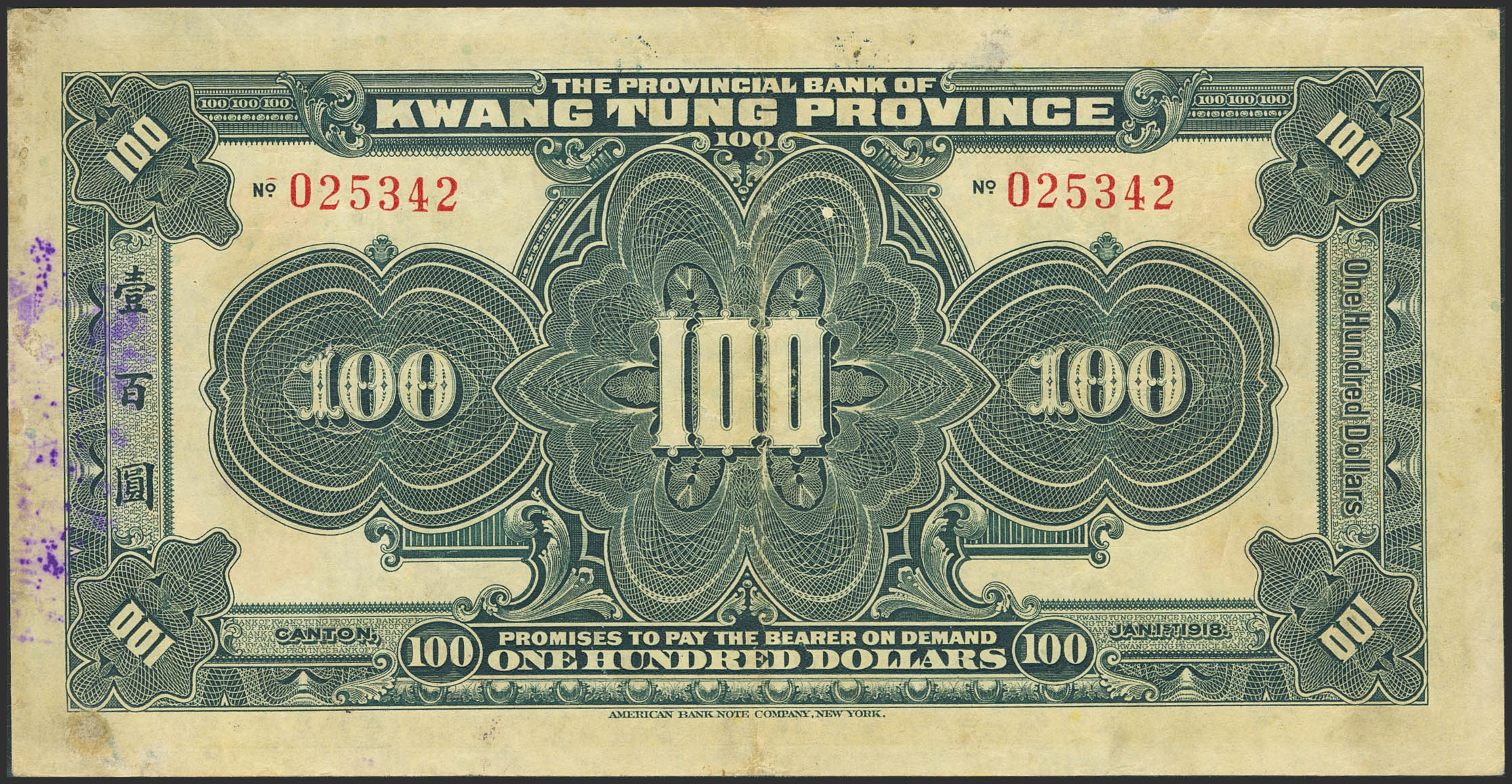 CHINA. 100 Dollars. 1 January 1918. Kwangtung Provincial Bank. (Pick: S2405). More than Very Fine.