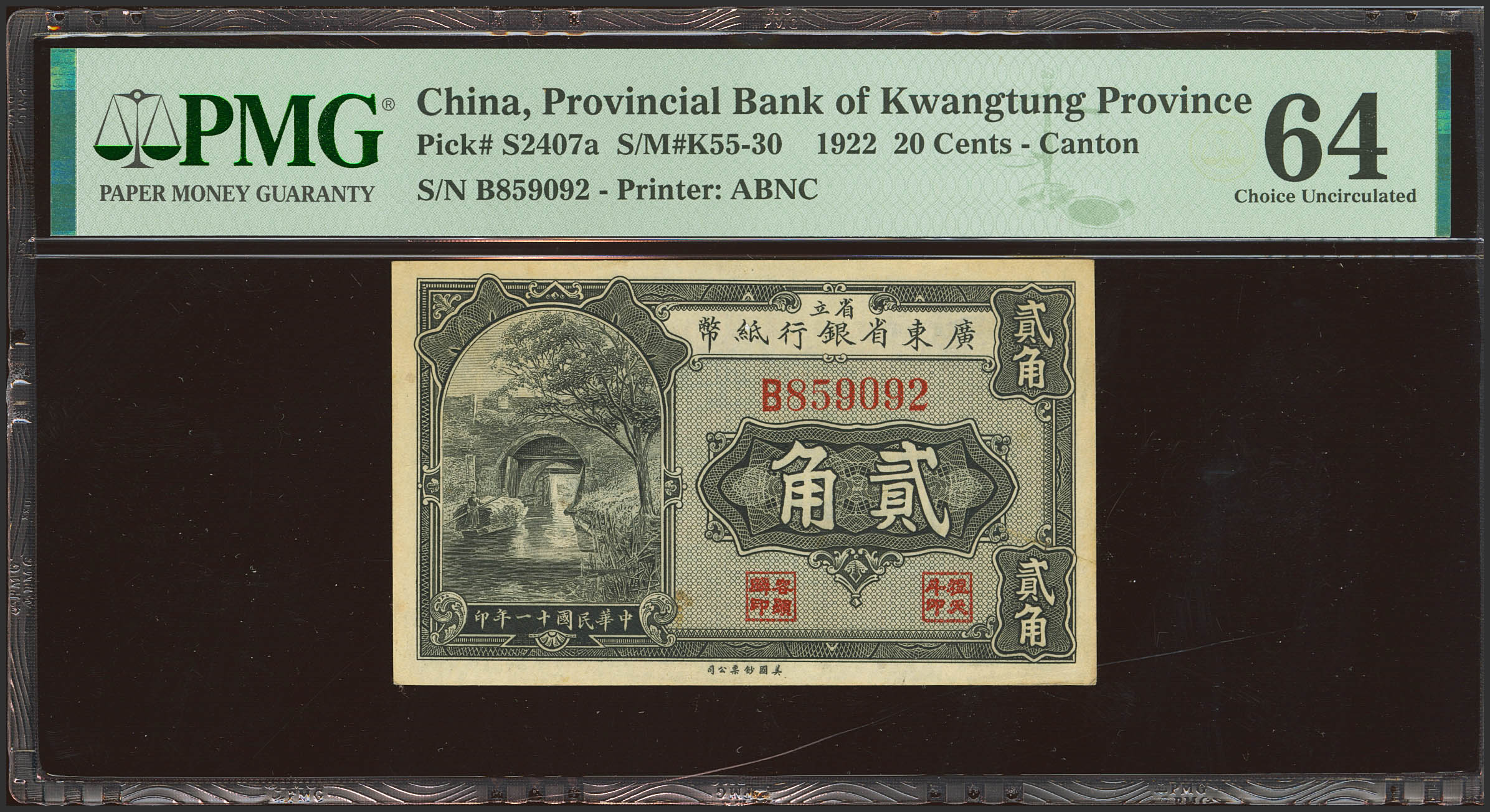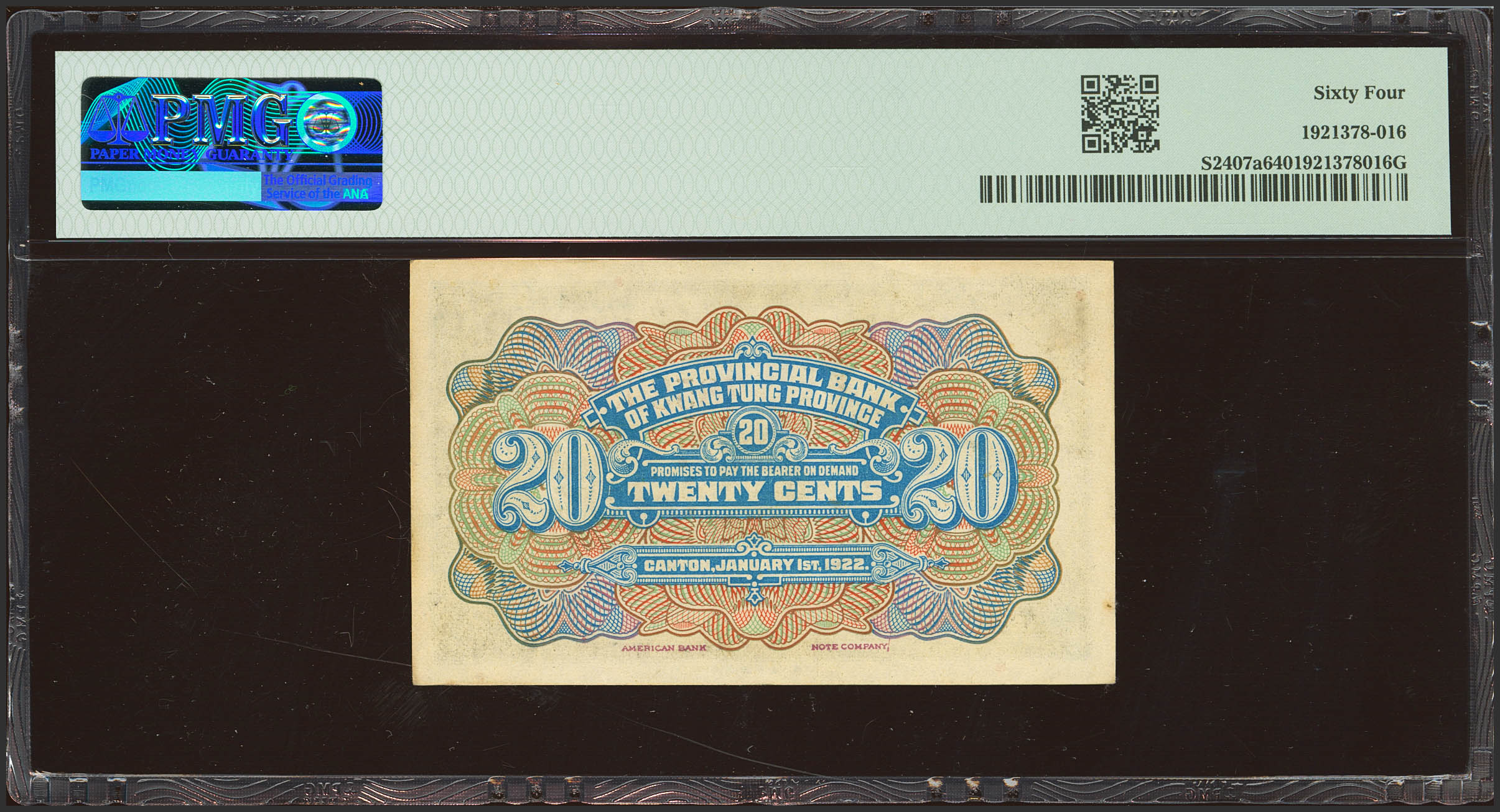 CHINA. 20 Cents. 1 January 1922. Provincial Bank of Kwang Tung Province. (Pick: S2407a, SM: K55-30). PMG64.