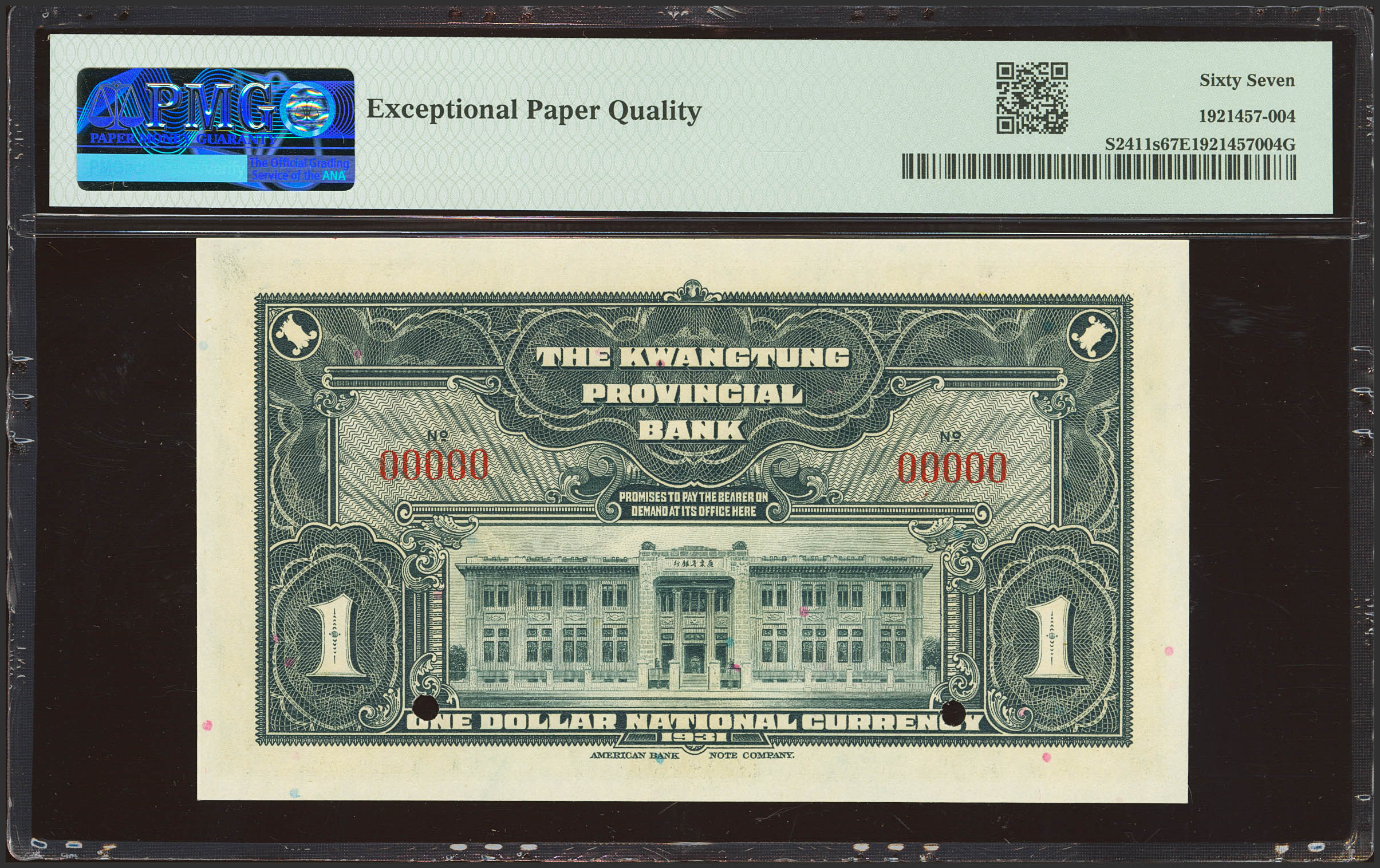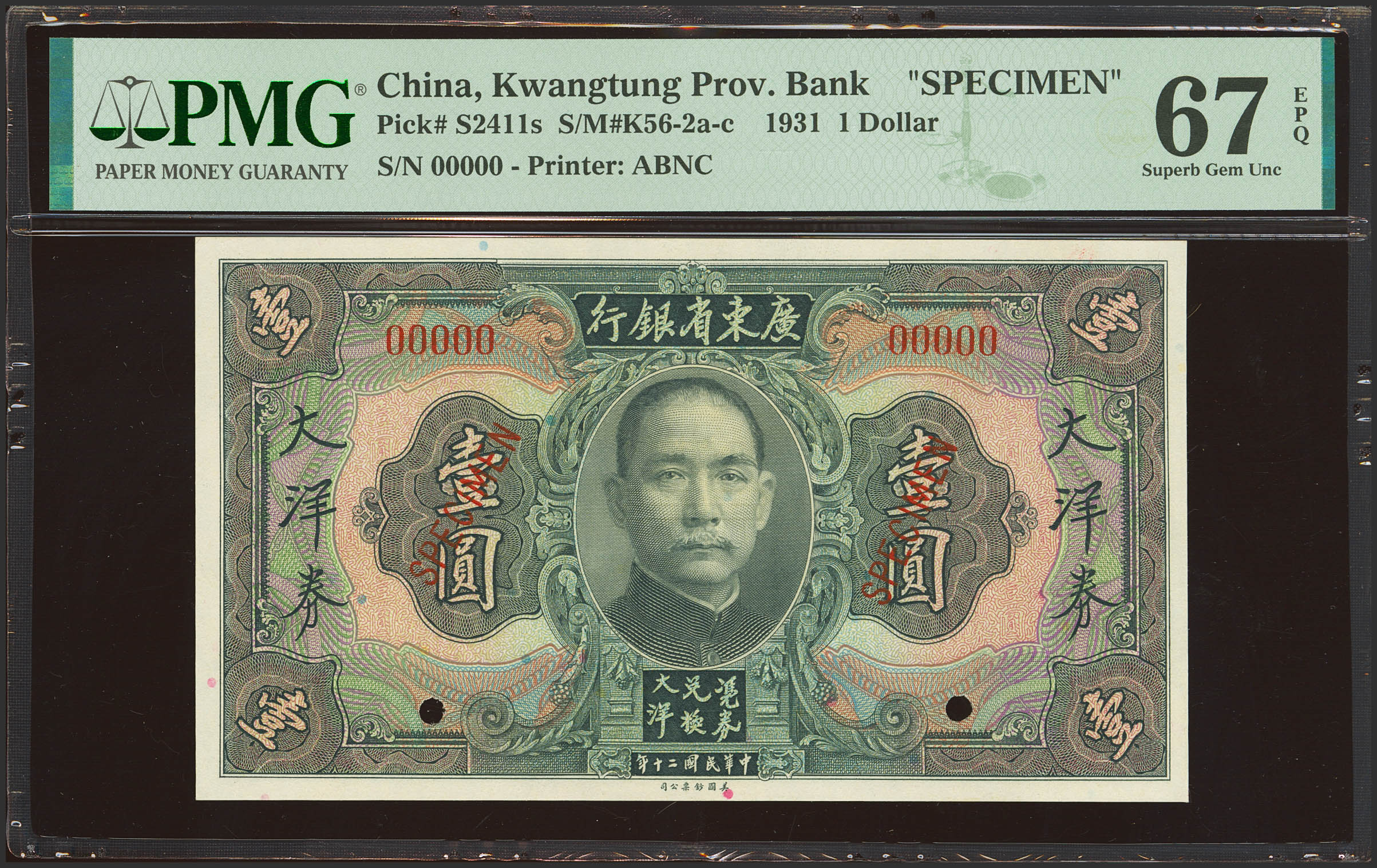 CHINA. 1 Dollar. 1931. Kwangtung Provincial Bank. Specimen. (Pick: S2411s, SM: K56-2a-c). PMG67EPQ.