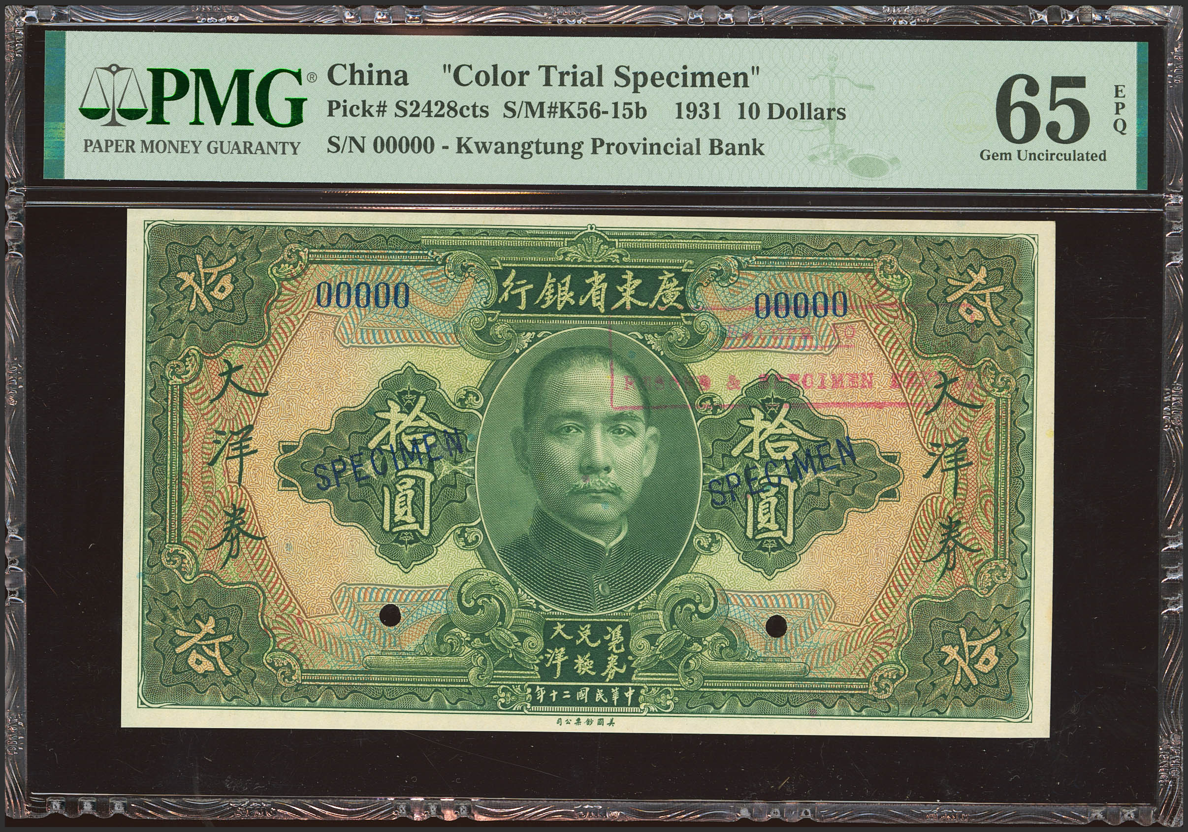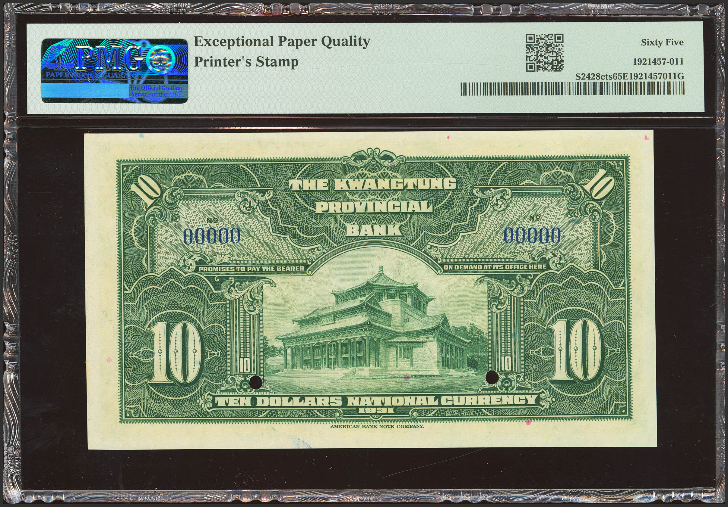 CHINA. 10 Dollars. 1931. Kwangtung Provincial Bank. Specimen. (Pick: S2428cts, SM: K56-15b, Reference B82439 from the BNB). PMG65EPQ (printer's stamp).