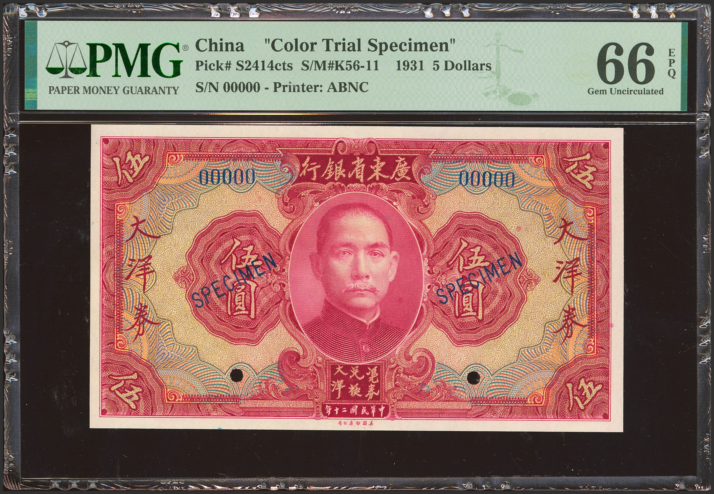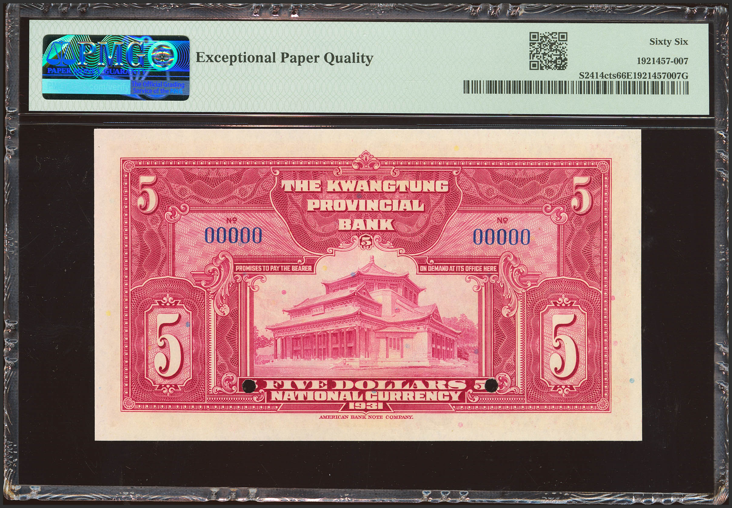 CHINA. 5 Dollars. 1931. Kwangtung Provincial Bank. Specimen. (Pick: S2414cts, SM: K56-11, Reference B82438 from the BNB). PMG66EPQ.