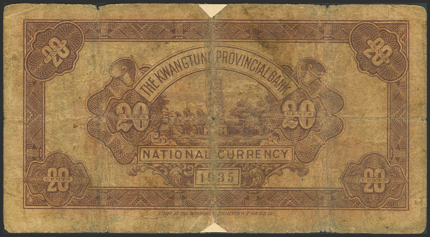 CHINA. 20 Cents. 1935. Kwangtung Provincial Bank. (Pick: S2434). Adhesive paper added to the top and bottom of the central fold. Fine.