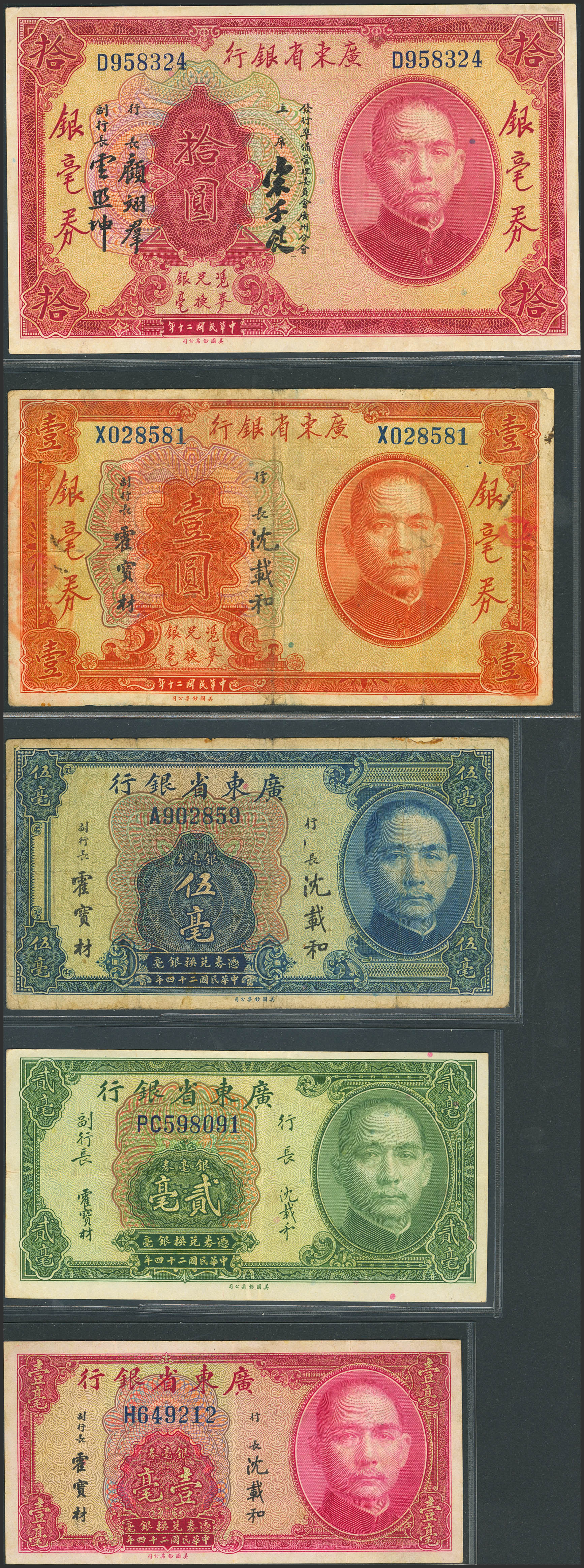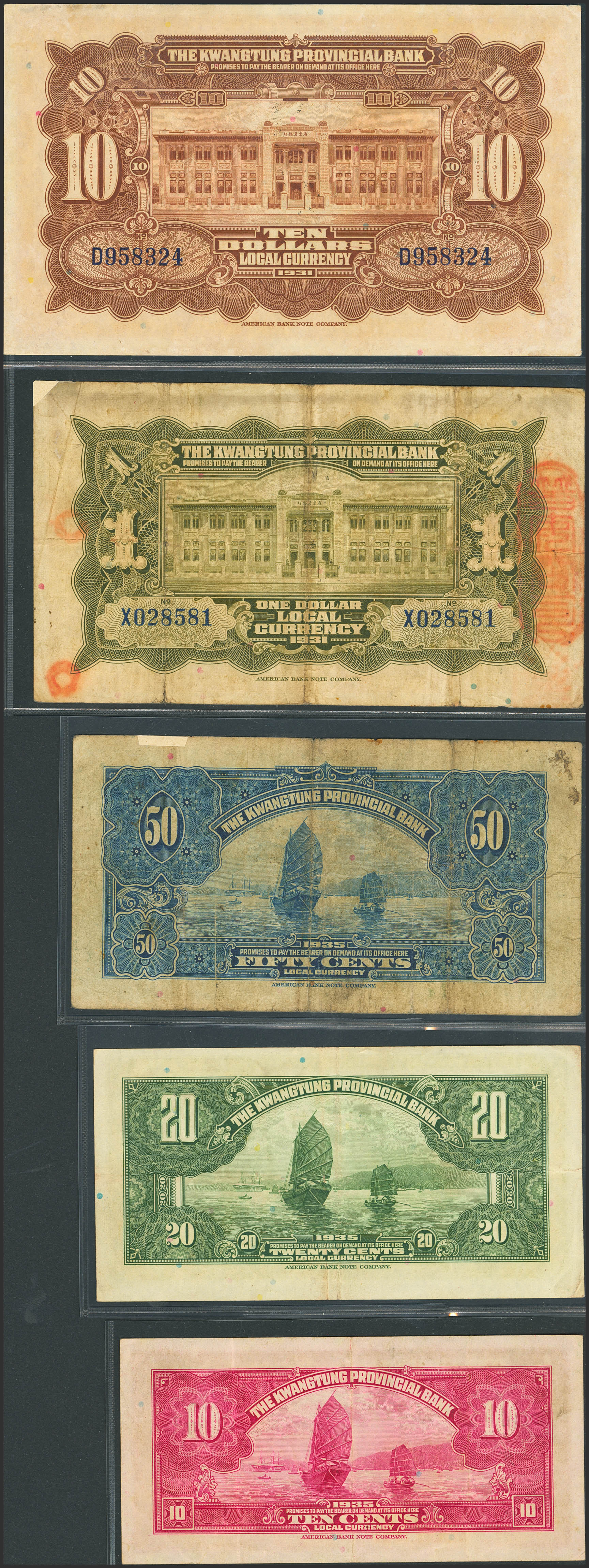 CHINA. Lot of 5 notes of Cents and Dollars. 1931 and 1935. Kwangtung Provincial Bank. (Pick: S2436a, 2437b, 2438a, 2421a, 2423D). Fine to About Uncirculated.