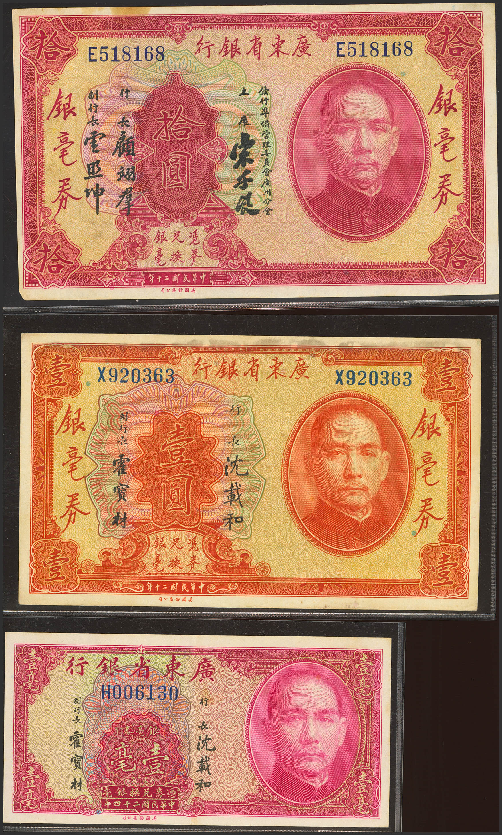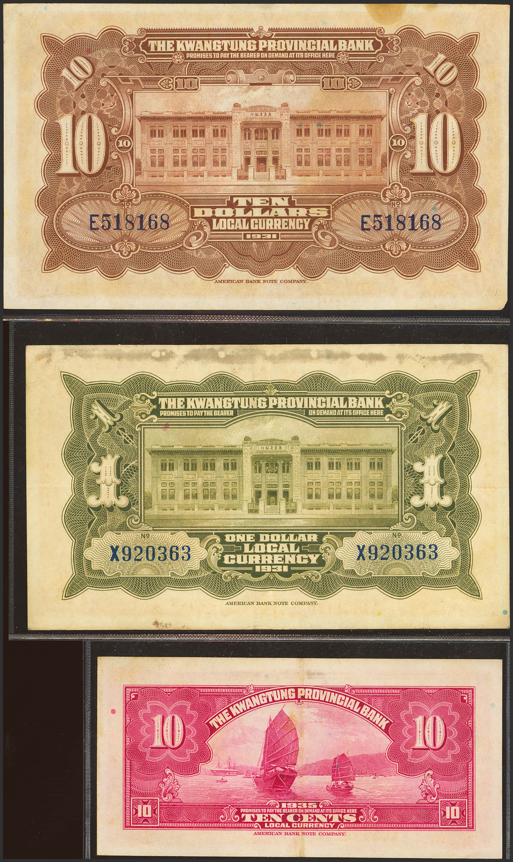 CHINA. Lot of 3 notes of Cents and Dollars. 1931 and 1935. Kwangtung Provincial Bank. (Pick: S2436a, S2421a, S2421d). Extremely Fine to About Uncirculated.