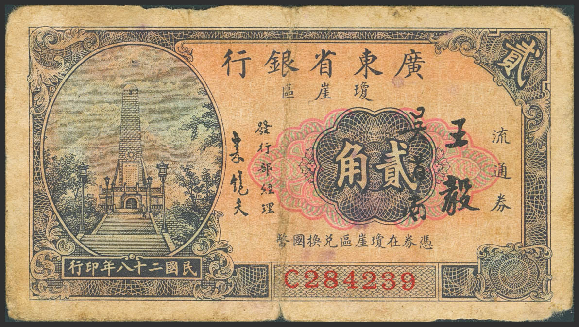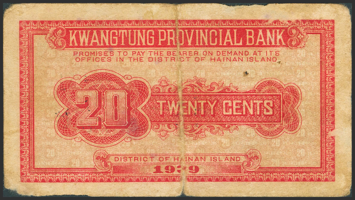 CHINA. 20 Cents. 1939. Kwangtung Provincial Bank. District of Hainan Island. (Pick: S2446). More than Fine.